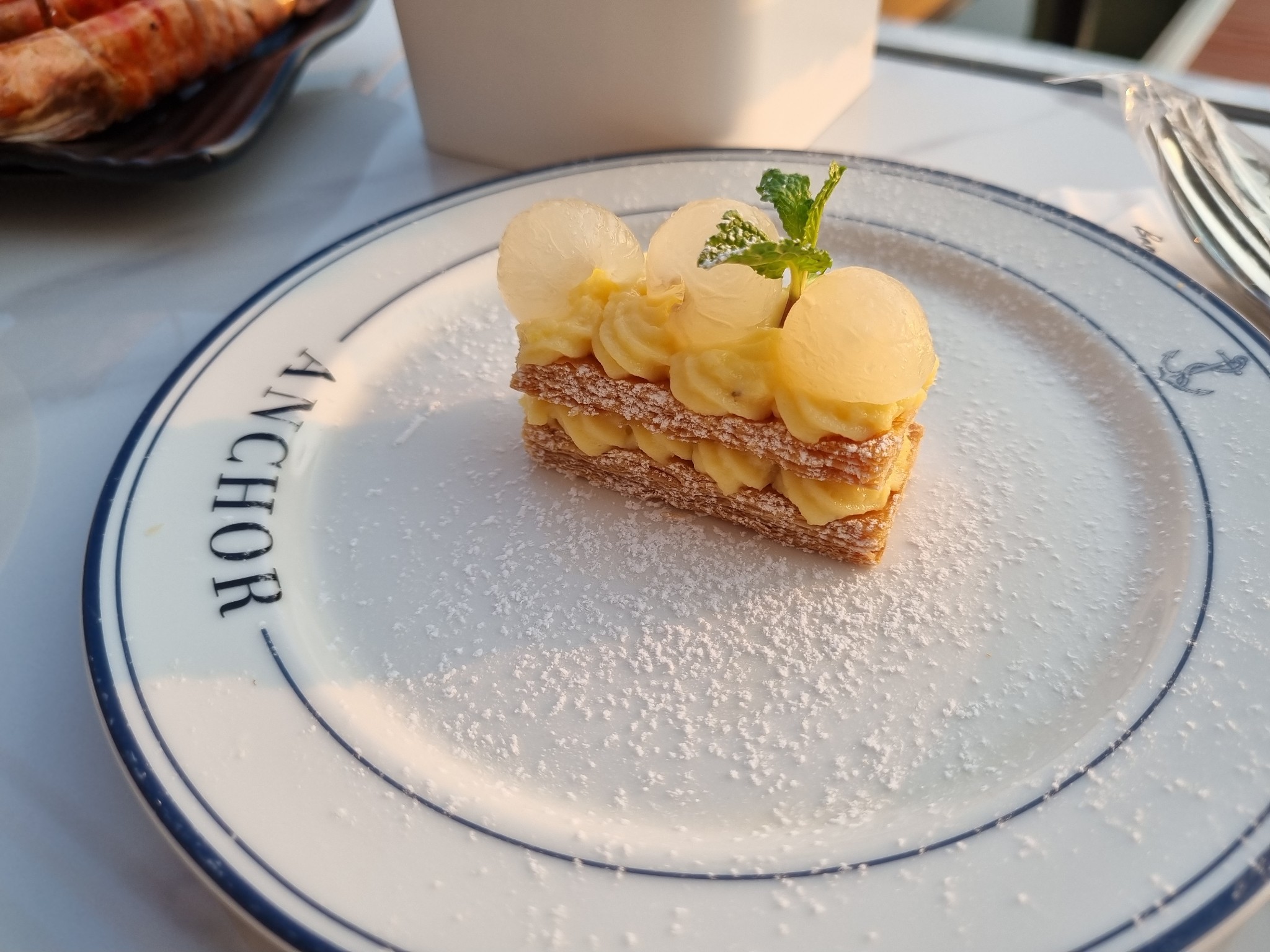 แองเคอร์มิลเฟย ขนมหวานสัญชาติฝรั่งเศส แป้งคล้ายโรตีกรอบ หวานน้ำตาล ครีมคัสตาร์ดหวานวานิลลา กลิ่นไม่ค่อยหอมโดดเท่าไหร่