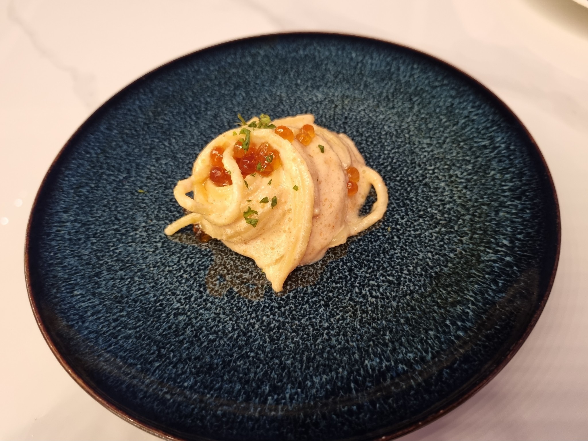 เส้นดีงามเหมือนเดิม เพิ่มเติมคือครีมซอสที่หอมมันเค็มเป็นที่สุด ได้ความนัวของซอสไข่ไก่ผสมกับกรุบแบบทรายๆของเมนไทโกะ เกินห้ามใจจริงๆครับ