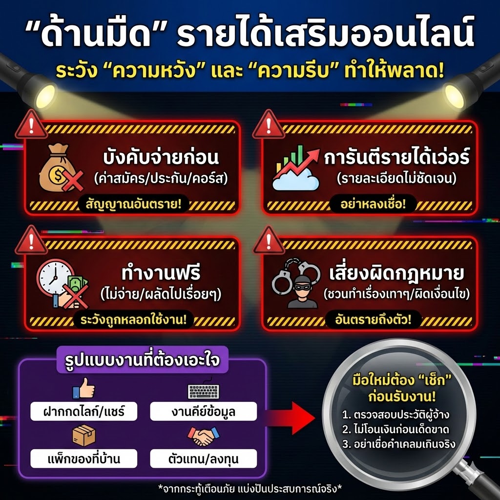 TL;DR: ขอประสบการณ์งานเสริมที่ควรเลี่ยง + สัญญาณเตือนก่อนโดนหลอก (ไม่ขอลิงก์/ไม่เอาชื่อเพจ)