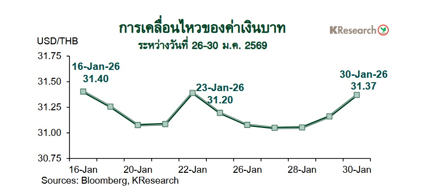 อนึ่ง กระทรวงการคลังสหรัฐฯ ได้เปิดเผยรายงานเรื่องนโยบายเศรษฐกิจมหภาคและอัตราแลกเปลี่ยนของคู่ค้าสำคัญของสหรัฐฯ เมื่อวันที่ 29 ม.ค. 2569 ซึ่งในรายงานฉบับนี้ไทยถูกเพิ่มชื่อเข้าไปอยู่ในกลุ่มติดตามใกล้ชิด (Monitoring list) ร่วมกับญี่ปุ่น จีน เยอรมนี ไอร์แลนด์ สิงคโปร์ เกาหลีใต้ สวิตเซอร์แลนด์ ไต้หวันและเวียดนาม อย่างไรก็ดี ปัจจัยนี้ยังไม่มีผลมากนักต่อการเคลื่อนไหวของเงินบาทในช่วงปลายสัปดาห์