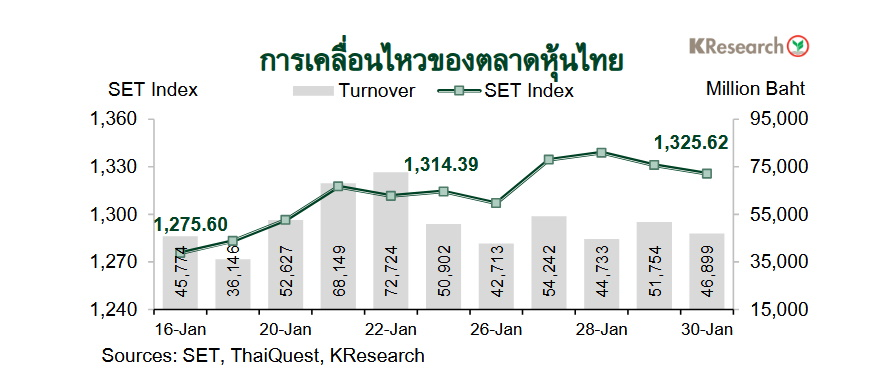 ส่วนสัปดาห์ (2-6 ก.พ. 69) บริษัทหลักทรัพย์กสิกรไทย จำกัด มองว่า ดัชนีหุ้นไทยมีแนวรับที่ 1,300 และ 1,285 จุด ขณะที่แนวต้านอยู่ที่ 1,345 และ 1,355 จุด ตามลำดับ โดยศูนย์วิจัยกสิกรไทยประเมินปัจจัยสำคัญที่ต้องติดตาม ได้แก่ ตัวเลขเงินเฟ้อเดือนม.ค. ของไทย ผลประกอบการไตรมาส 4/2568 ของบจ.ไทย และทิศทางเงินทุนต่างชาติ