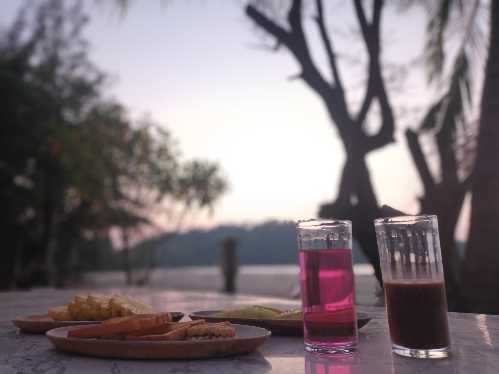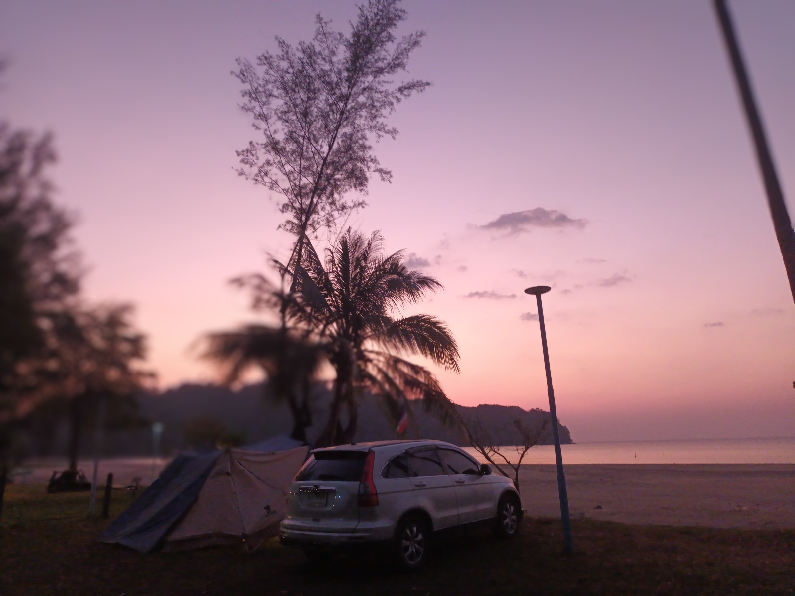 แสงเริ่มอ่อนแรงมากขึ้น จน 6 โมงกว่า เตรียมรองท้องนิดหน่อย ขอบคุณมะเอามะม่วงมาให้จานนึง ยกออกไปยืนทำทรงข้างๆ เต็นท์ แสงสุดท้ายสวยขึ้นเรื่อยๆ อากาศสบายๆ คลื่นสงบ ทะเลสวยงาม บรรยากาศดีต่อใจ มื้อนี้แค่อยู่ท้องพอแล้ว