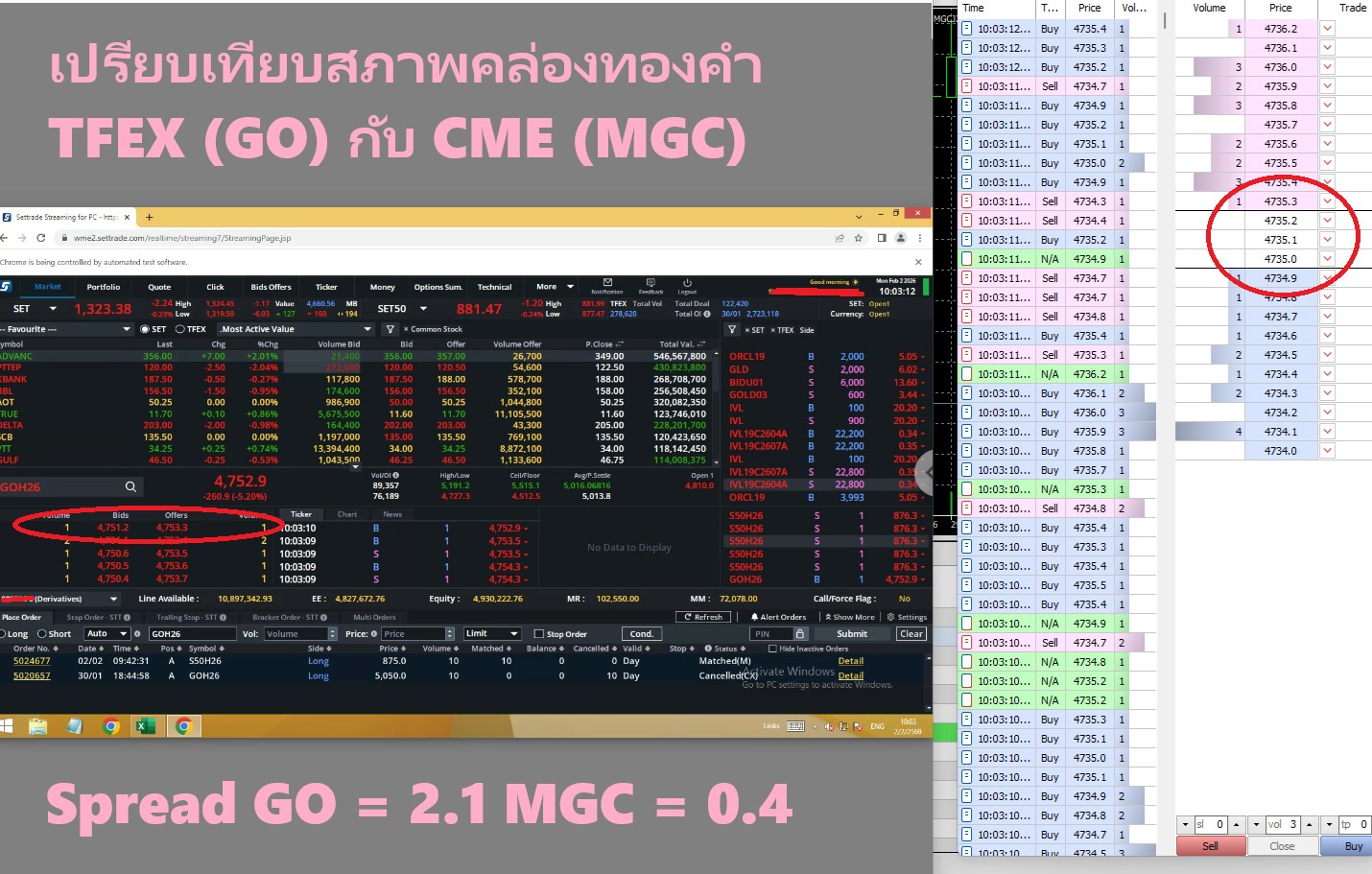 ซึ่งเราแคป ณ วินาทีเดียวกันเพื่อไม่ให้ Bias (จริง ๆ Bias ไทยด้วยซ้ำ เพราะเป็นสภาพคล่องช่วงกลางวันของเอเชีย-กลางคืนของสหรัฐ) จะเห็นว่า GO มีส่วนต่าง Bid-Offer แรกห่างกันถึง 2.1 จุด ในขณะที่ MGC แค่ 0.4 จุด