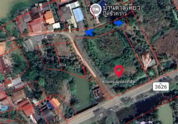 ทางเราได้เจรจาขอแบ่งซื้อที่ดินเข้าออกกันได้แล้ว พอได้หมายเลขโฉนดมา เช็คกับทาง Landmap มันจะมีแปลงที่ กากบาทสีน้ำเงินขึ้นมา