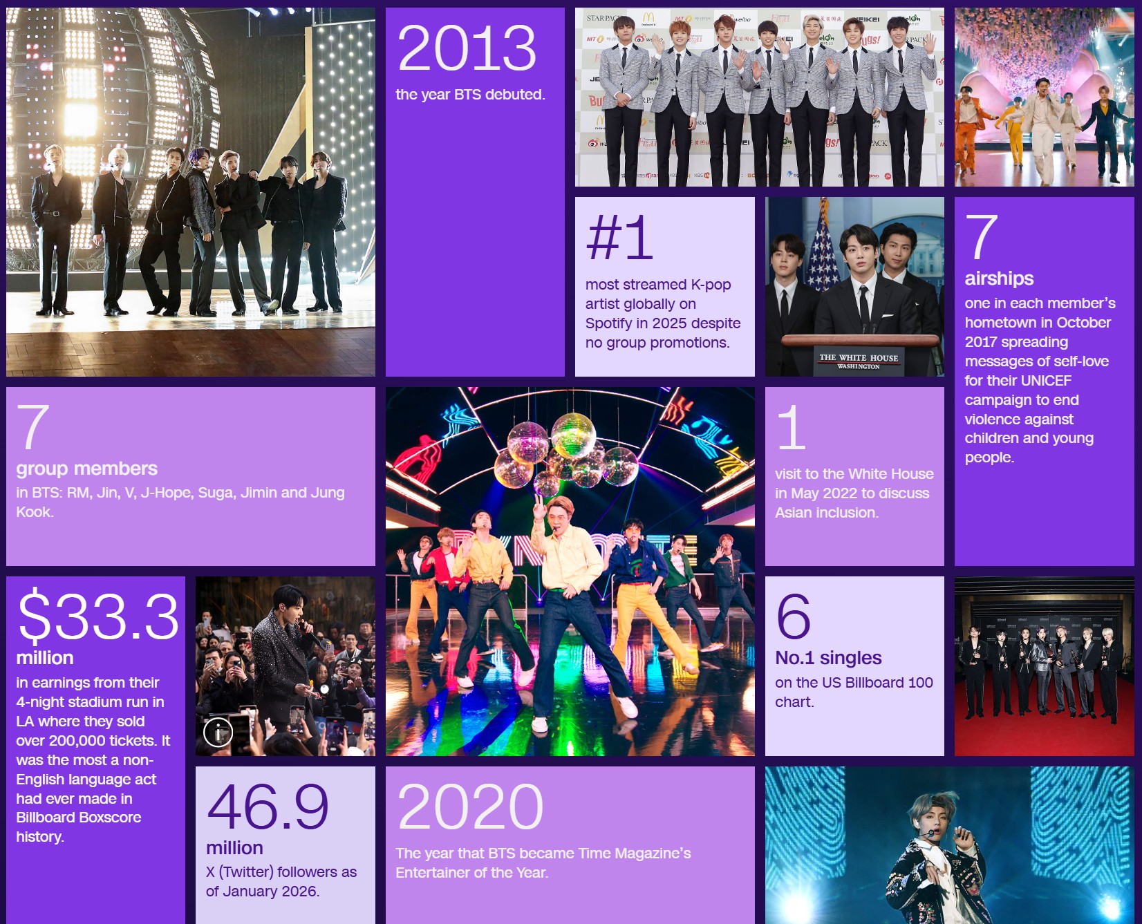 - อันดับ 1 บน Billboard Hot 100: มีเพลงขึ้นอันดับหนึ่งถึง 6 เพลง (เช่น Dynamite, Butter)