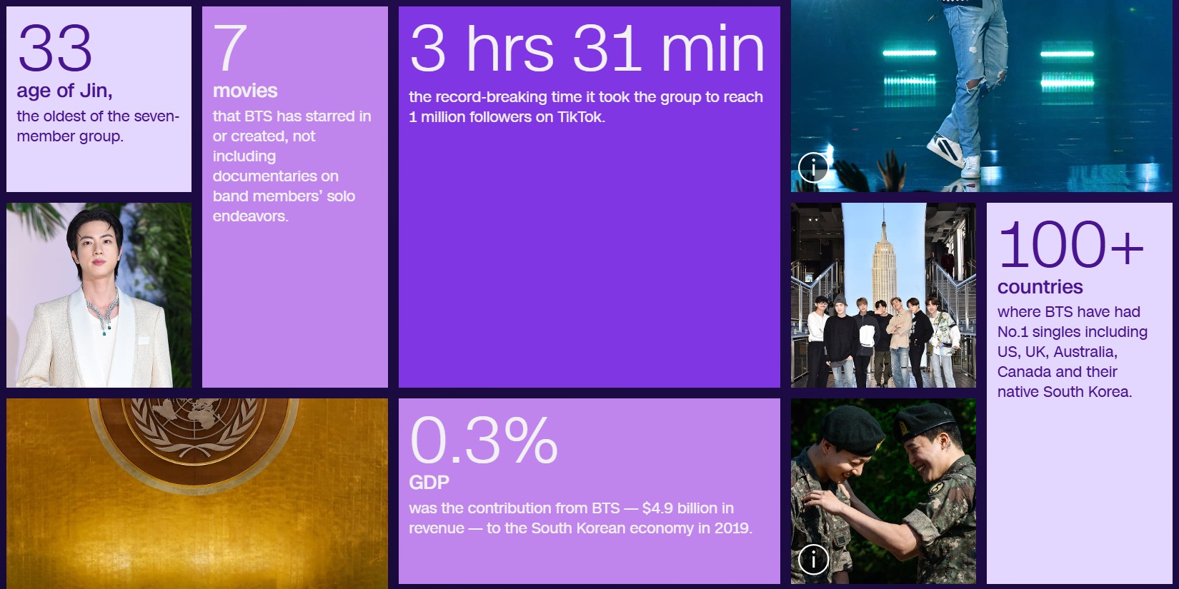 บทบาทระดับโลก: BTS ได้กล่าวสุนทรพจน์ในที่ประชุมสมัชชาใหญ่แห่งสหประชาชาติ (UN) ถึง 3 ครั้ง และได้รับเชิญไปยังทำเนียบขาวเมื่อเดือนพฤษภาคม 2022