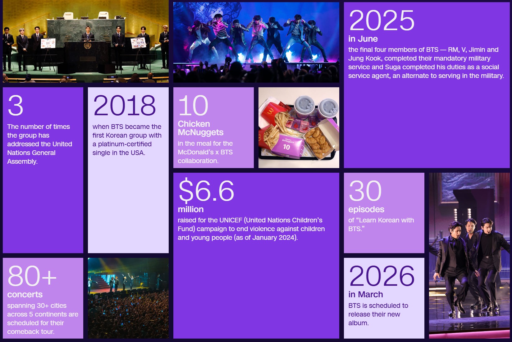 - แผนงานปี 2026: การกลับมาทัวร์คอนเสิร์ตในปีนี้ มีกำหนดการจัดขึ้นมากกว่า 80 รอบ ใน 30 เมืองใหญ่ ครอบคลุม 5 ทวีปทั่วโลก