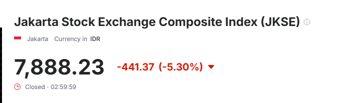 ดัชนี JCI ปรับตัวลดลงอย่างรุนแรงต่อเนื่องจากสัปดาห์ก่อนที่ร่วงไปแล้วเกือบ 7% ซึ่งถือเป็นการดิ่งลงหนักที่สุดในรอบปี โดยนักวิเคราะห์เปิดเผยว่า การเคลื่อนไหวในวันนี้สะท้อนภาพแรงเทขายในตลาดหุ้นทั่วโลก มากกว่าจะเป็นปัจจัยเฉพาะเจาะจงของอินโดนีเซีย ซึ่งเห็นได้ชัดว่าทุกภาคส่วนกำลังร่วมมือกันแก้ไขปัญหา และเห็นความตั้งใจจริงจากผู้กำหนดนโยบายที่จะหาทางออกที่ปฏิบัติได้จริง
