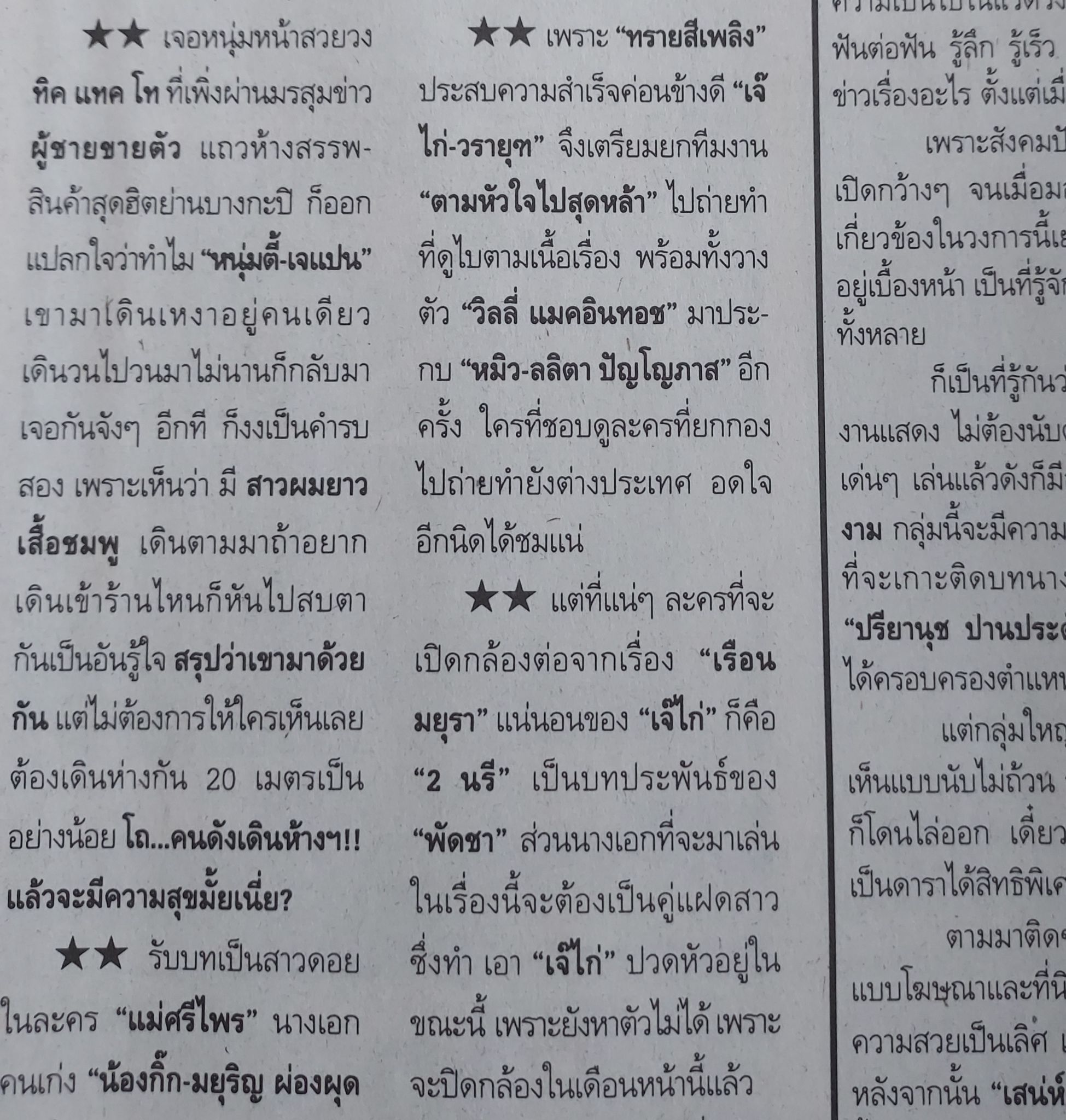 แต่จากเนื้อข่าวชิ้นนี้  ก็คงกระจ่างมากขึ้น  ว่านางเอกที่เคยถูกทาบทามคนนั้น  ต้องไม่ใช่ "หมิว-ลลิตา"  และ "แหม่ม-คัทลียา"  เพราะเจ๊ไก่ได้เตรียมละครเรื่อง "ตามหัวใจไปสุดหล้า" กับ "เรือนมยุรา" ไว้ให้ตามลำดับ
