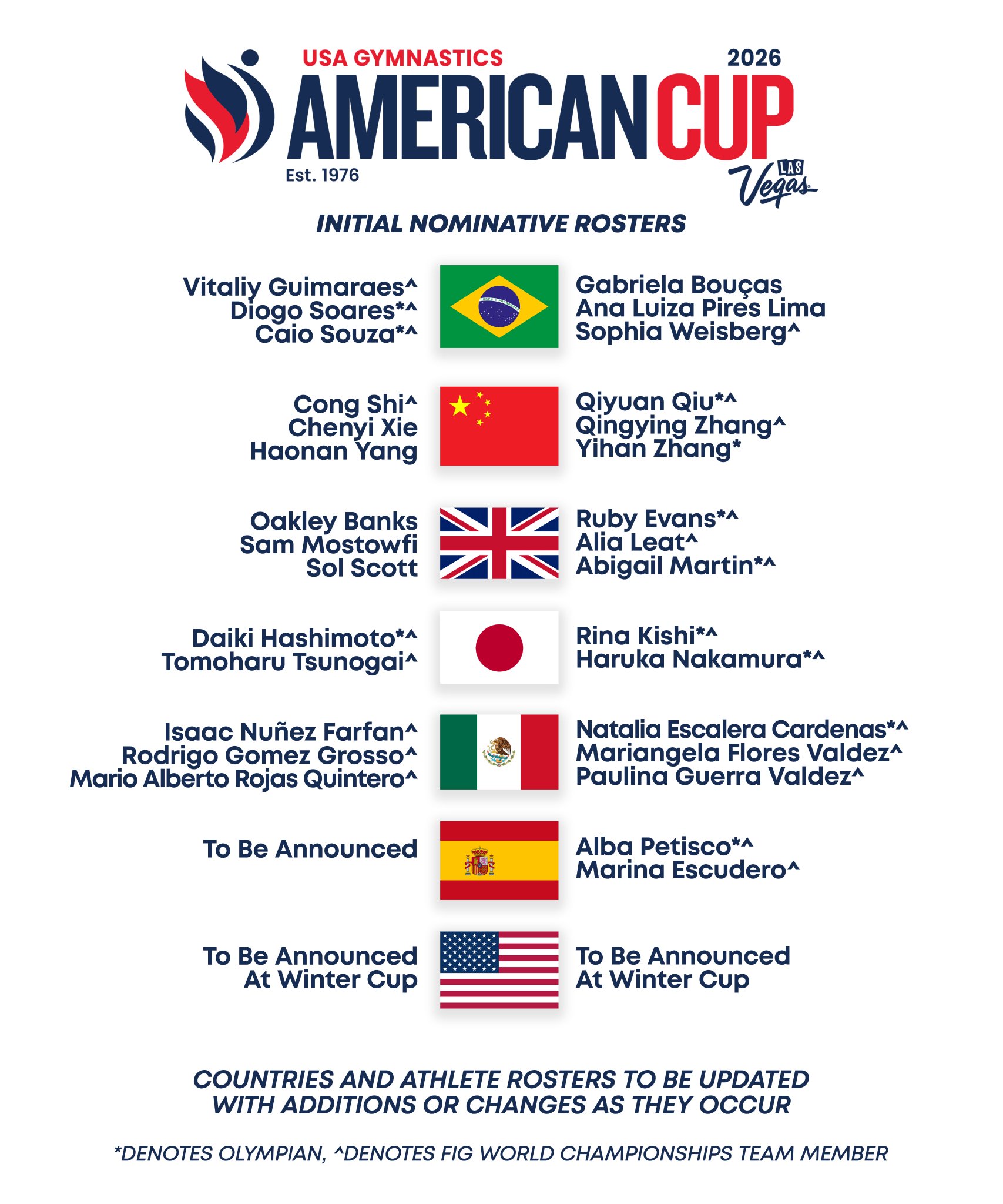 รายการ American Cup 2026 จะฉลองครบรอบ 50 ปีในปีนี้ ซึ่งจะจัดขึ้นในรัฐ Nevada เมือง Las Vegas และจะมี 7 ชาติเข้าร่วม ได้แก่ บราซิล, จีน, สหราชอาณาจักร, ญี่ปุ่น, เม็กซิโก, สเปน และสหรัฐอเมริกาซึ่งเป็นเจ้าภาพ โดยในการแข่งขันครั้งนี้จะมีการแข่งขันทั้งประเภทชายและหญิง มีจำนวนนักกีฬาชาติละ 3 คน (ส่วนใหญ่) ซึ่งจะเริ่มทำการแข่งขันในวันเสาร์ที่ 7 มีนาคม 2569 นี้ และจะมีการถ่ายทอดสดผ่านทางช่อง NBC ซึ่งเป็นช่องข่าวกีฬาของประเทศสหรัฐอเมริกาครับ