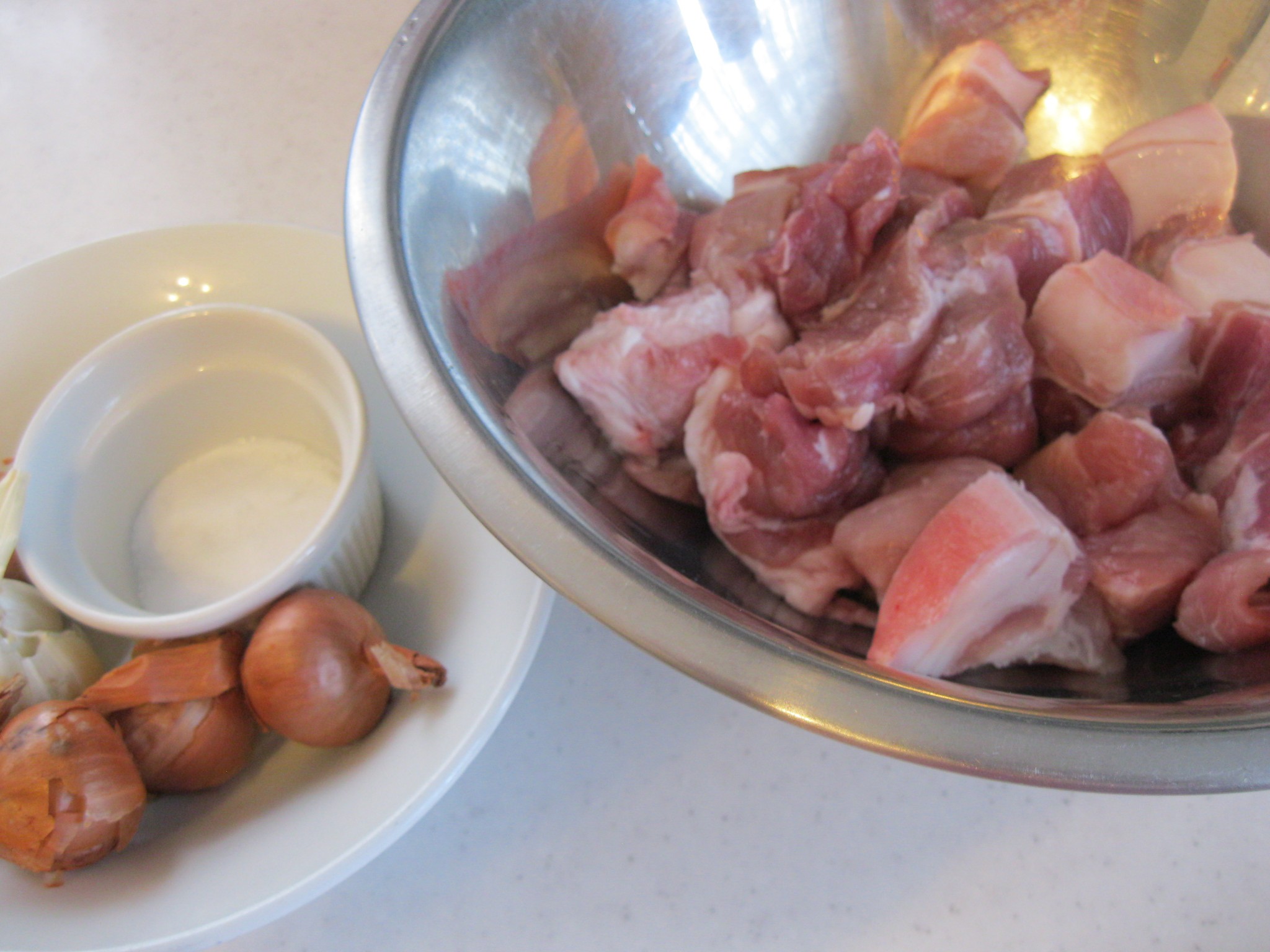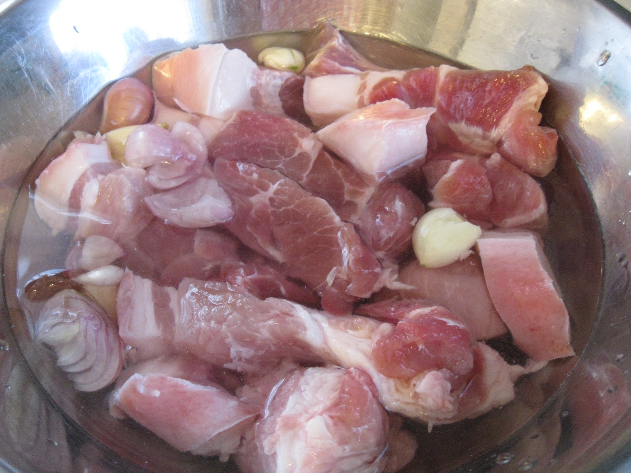 วิธีทำ ล้างหั่นหมูสามชั้นเป็นชิ้น ขนาดตามชอบ ทุบหอมแดงและกระเทียมพักไว้
