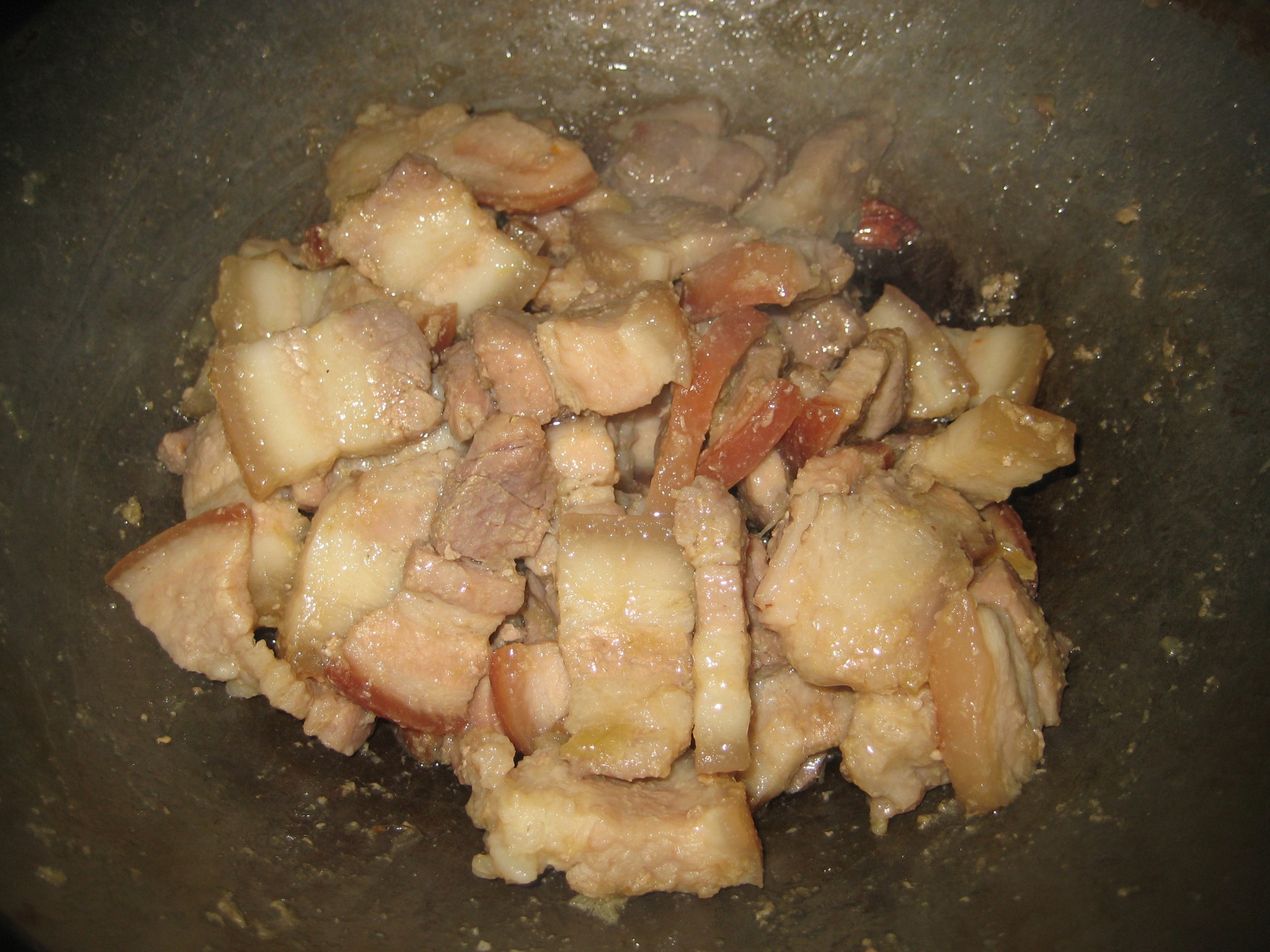 ตั้งกระทะบนเตาใส่หมูที่คลุกเอาไว้ลงไปผัดจนเนื้อหมูแห้งและมีน้ำมันของหมูออกมา