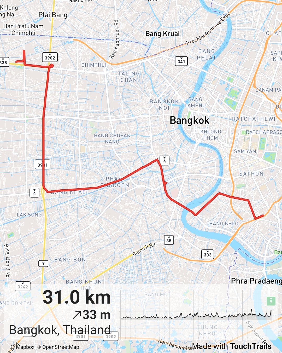 : บางบอน - วัดสิงห์ - วุฒากาศ - ตลาดพลู - บางยี่เรือ - แยกท่าพระ - พาณิชย์ธน - แยกไฟฉาย - บางขุนนนท์ - พาต้า - สนามหลวง - ท่าพระจันทร์ - ท่าช้าง - วัดโพธิ์ (ขสมก. เขต 5)