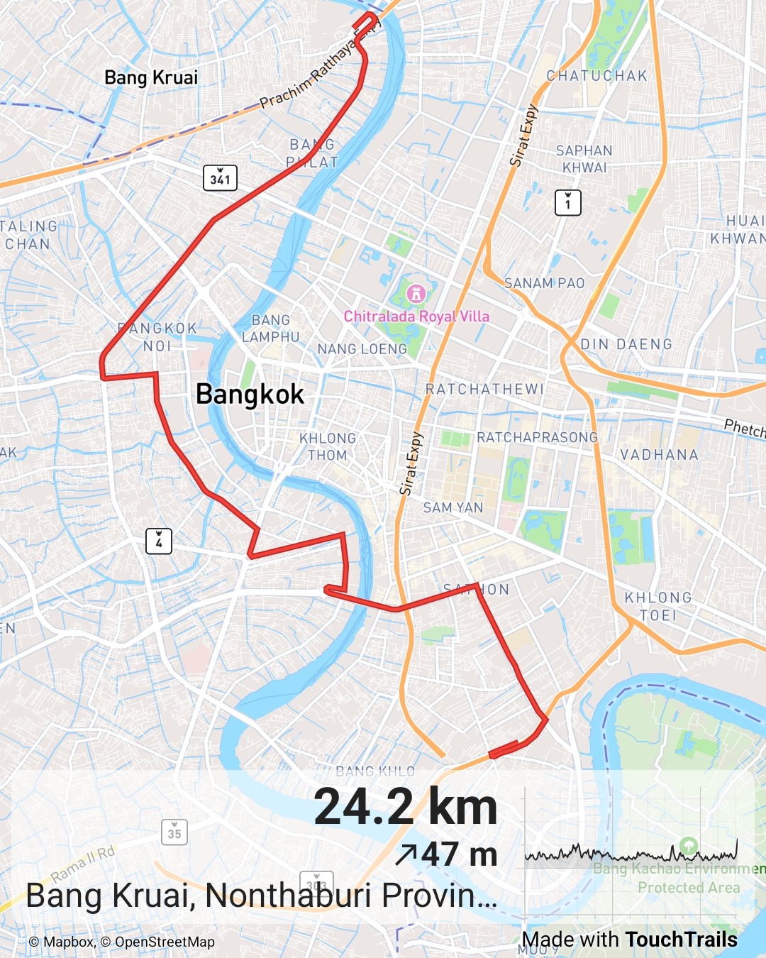 : พระราม 7 - บางพลัด - แยกบรมราชชนนี - บางขุนนนท์ - แยกไฟฉาย - พรานนก - อิสรภาพ - แยกบ้านแขก - วงเวียนใหญ่ - ไอคอนสยาม - สะพานตากสิน - สาทร - แยกนราธิวาส - ถนนจันทน์ - เซ็นทรัลพระราม 3 (ขสมก. เขต 7)