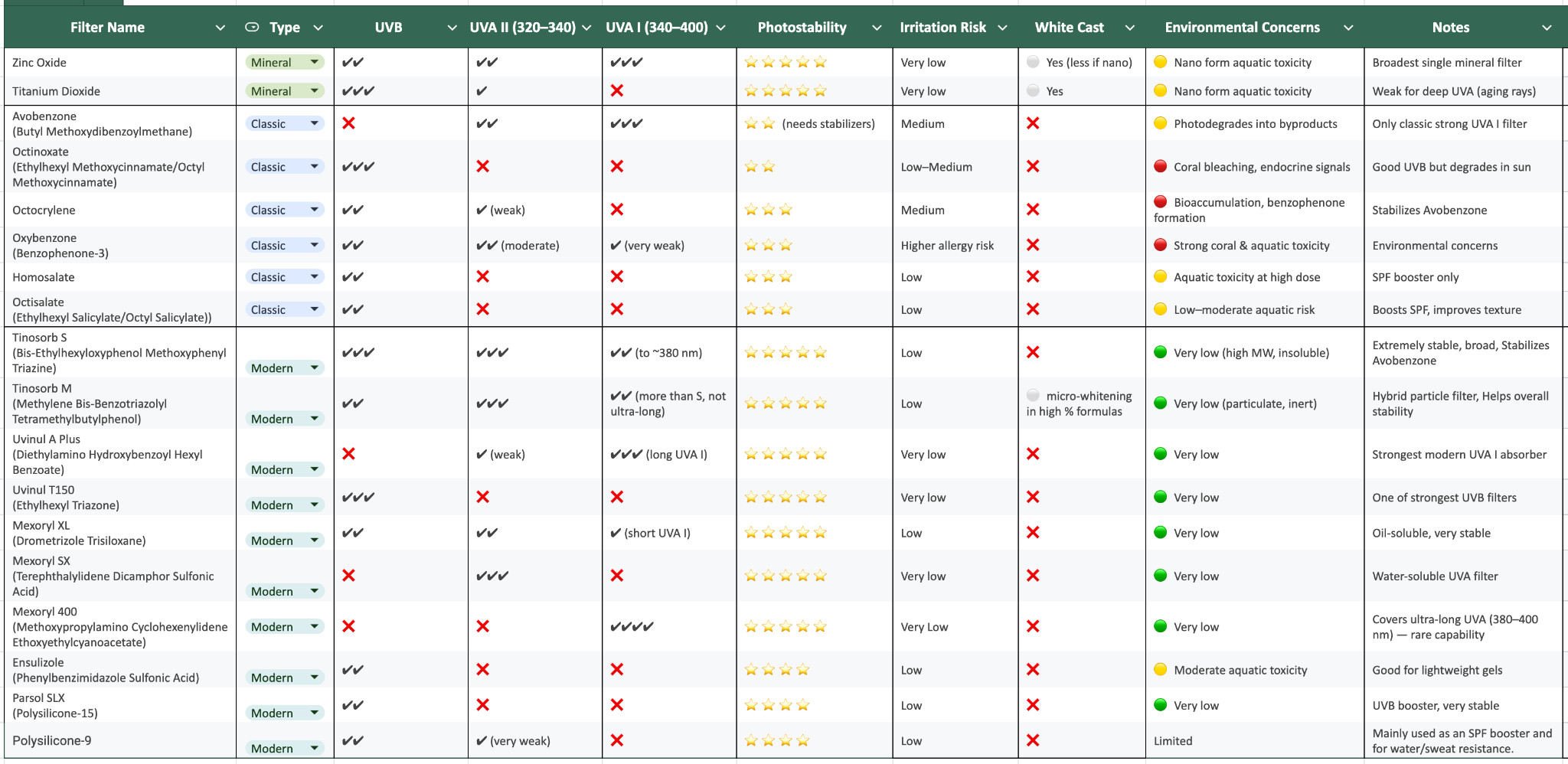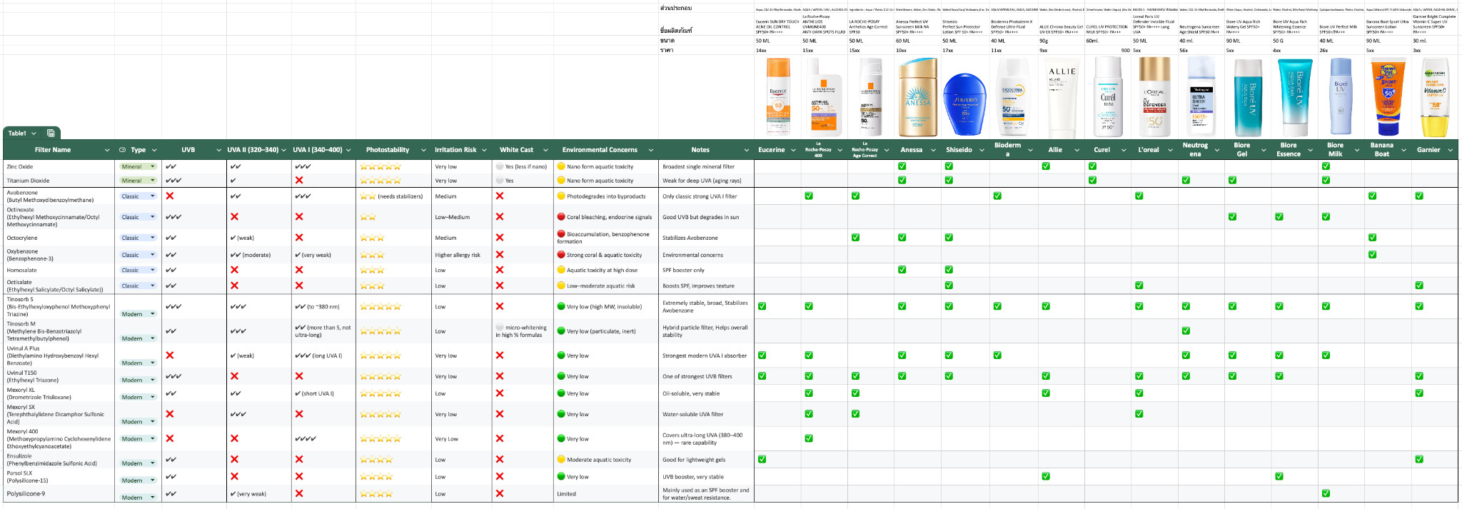 ในตารางรีวิวจะประกอบไปด้วยกันแดดยี่ห้อดัง 15 ตัวรวมถึงสารกันแดดและคุณสมบัติ ส่วนด้านบนรูปขวดกันแดดจะมีชื่อรุ่น ปริมาณและราคาเต็ม (ช่วงโปรนี่หลายๆ ตัวลดไปเยอะเลย) รีวิวอันนี้เน้นไปที่สารกันแดดจึงไม่ได้ดูเรื่องอื่นๆ เช่น ผิวสัมผัส การให้ความชุ่มชื้นหรือสารบำรุงผิว