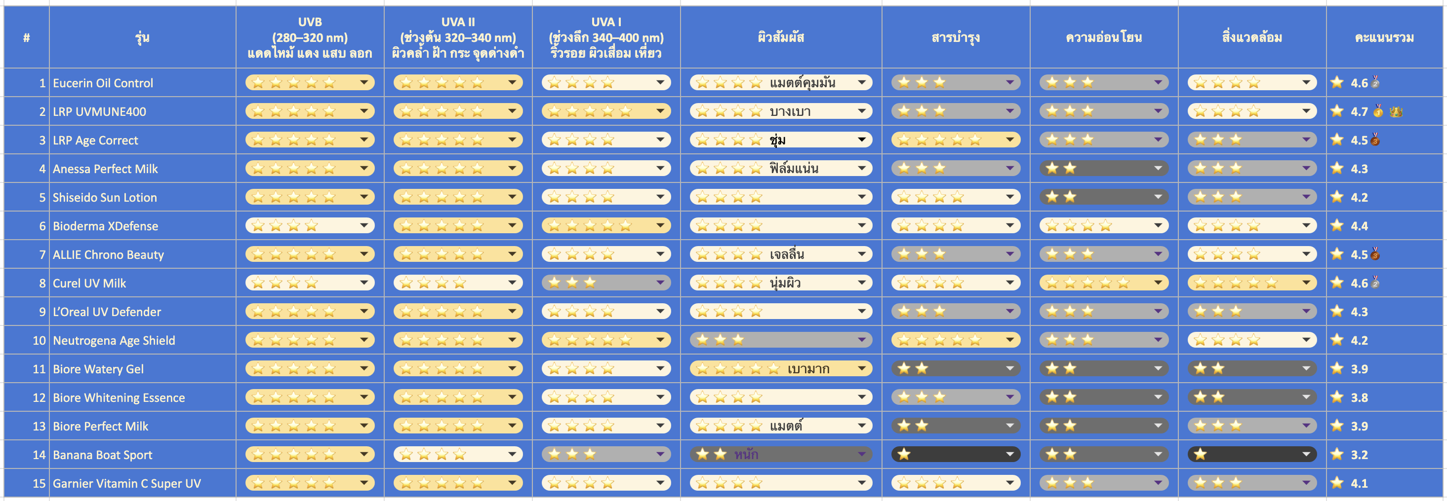 *คะแนนรวมดูจากส่วนประกอบโดยละเอียดและน้ำหนักความสำคัญของแต่ละด้านไม่ใช่ค่าเฉลี่ยของดาว เช่น Shiseido ได้ดาวเท่า Anessa ทุกด้านยกเว้นสารบำรุงผิวที่ได้เยอะกว่า Anessa หนึ่งดวง แต่กลับได้คะแนนรวมน้อยกว่าเพราะให้ความสำคัญกับสิ่งแวดล้อมมากกว่าสารบำรุงผิว Shiseido ใช้สารกันแดดเคมีรุ่นเก่าสามตัวในขณะที่ Anessa ใช้แค่สองตัวเป็นต้น