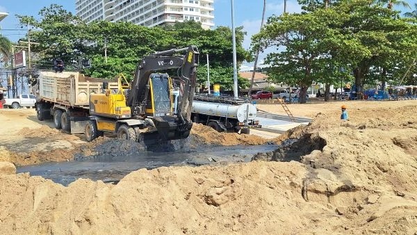 วันนี้ ( 2 ก.พ.) ผู้สื่อข่าวได้ลงพื้นที่ตรวจสอบข้อเท็จจริงบริเวณชายหาดจอมเทียน อ.บางละมุง จ.ชลบุรี ซึ่งก็พบว่าบริเวณดังกล่าวเป็นชายหาดที่ผู้รับจ้างโครงการปรับปรุงภูมิทัศน์ชายหาดจอมเทียน ได้เข้ามาดำเนินการวางท่อระบายน้ำและล้างท่อภายในบ่อน้ำฝน เพื่อป้องกันน้ำท่วมหากมีฝนตกหนัก