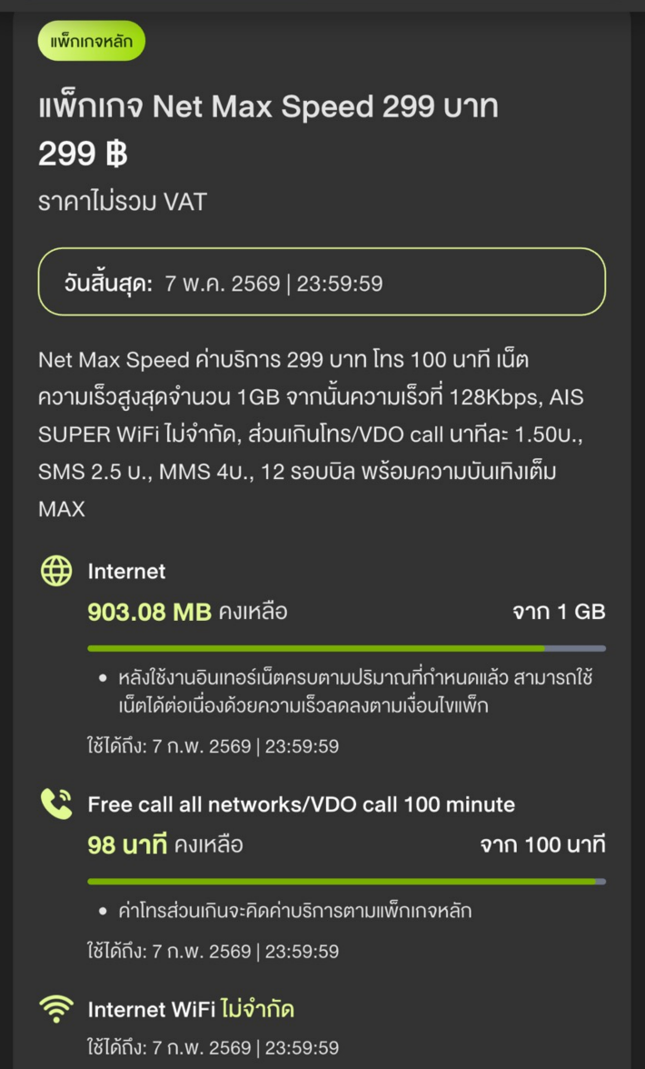 เนื่องจากใช้เบอร์ AIS แล้วมีซิมแถมมาด้วย พร้อมแพคเกจ ตอนแรกซิมหลักก็เป็นโปรหนึ่งพันกว่าบาท แต่ได้เปลี่ยน package ไปเป็นตัว fixxy 399 แล้ว ซึ่งจะได้ การใช้งาน internet ที่ 70GB