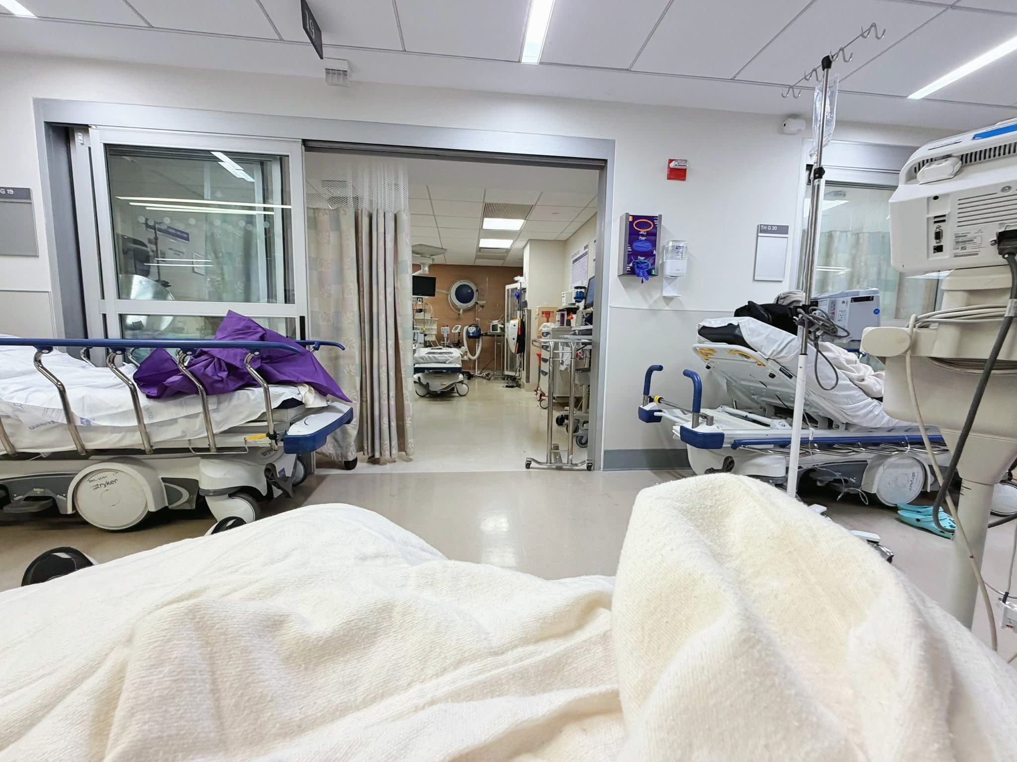 ฟีลเหมือนอยู่ในซีรีย์ ER คนเข็นรีบเข็น เกือบจะวิ่ง แล้วพาเราขึ้นเตียงหน้าเค้าท์เตอร์หมอ ..เตียงไม่ได้อยู่ในห้อง แต่มีเตียงที่อยู่บริเวณทางเดินรอบห้อง ER เต็มไปหมด