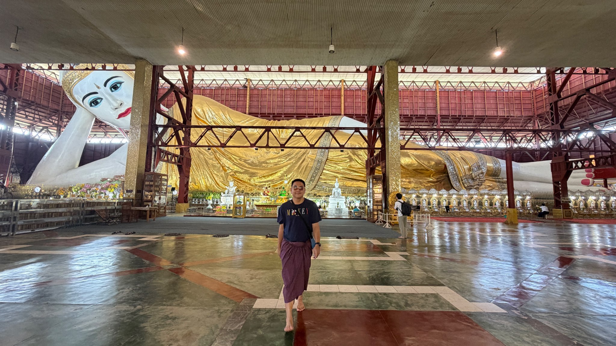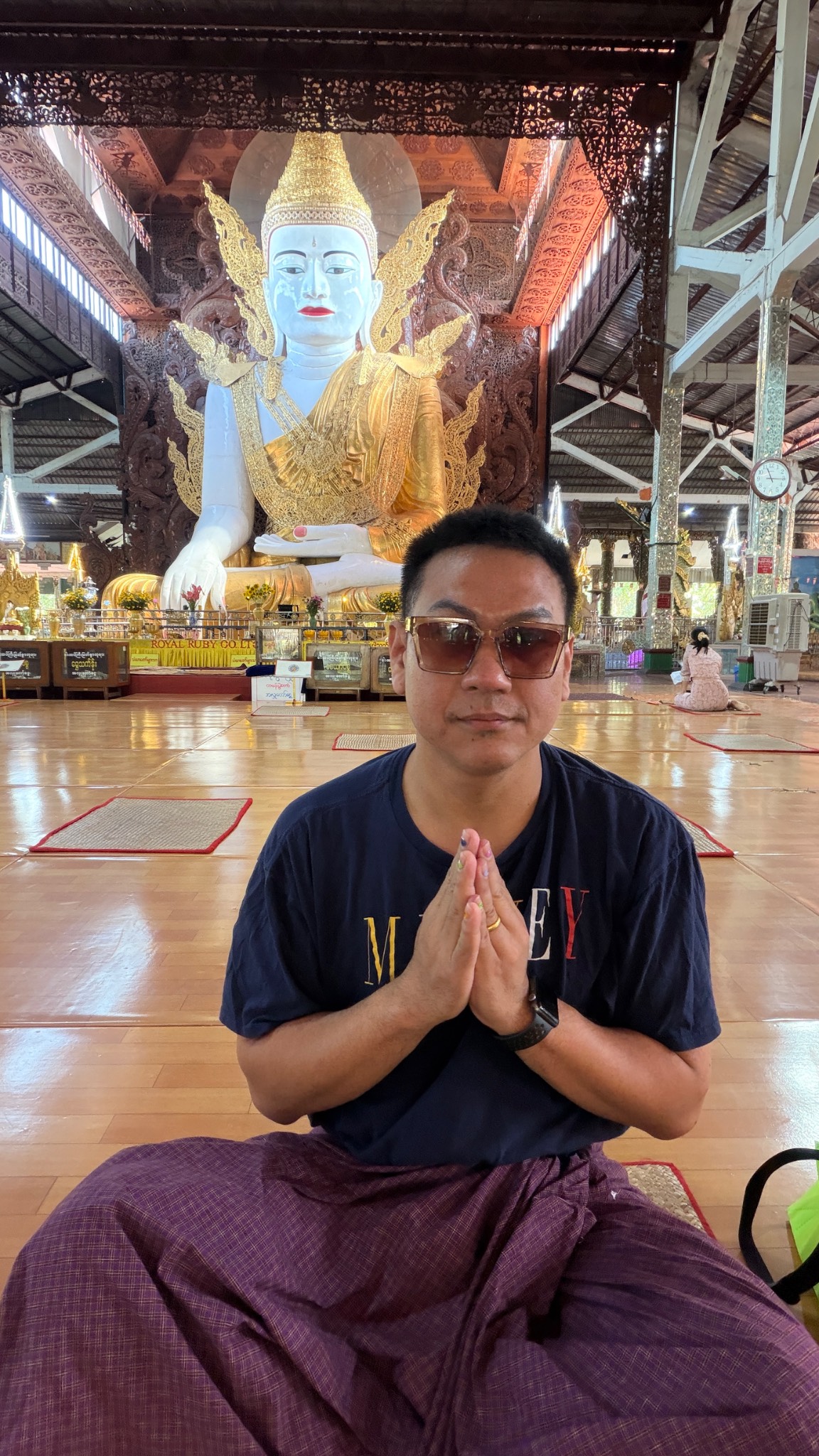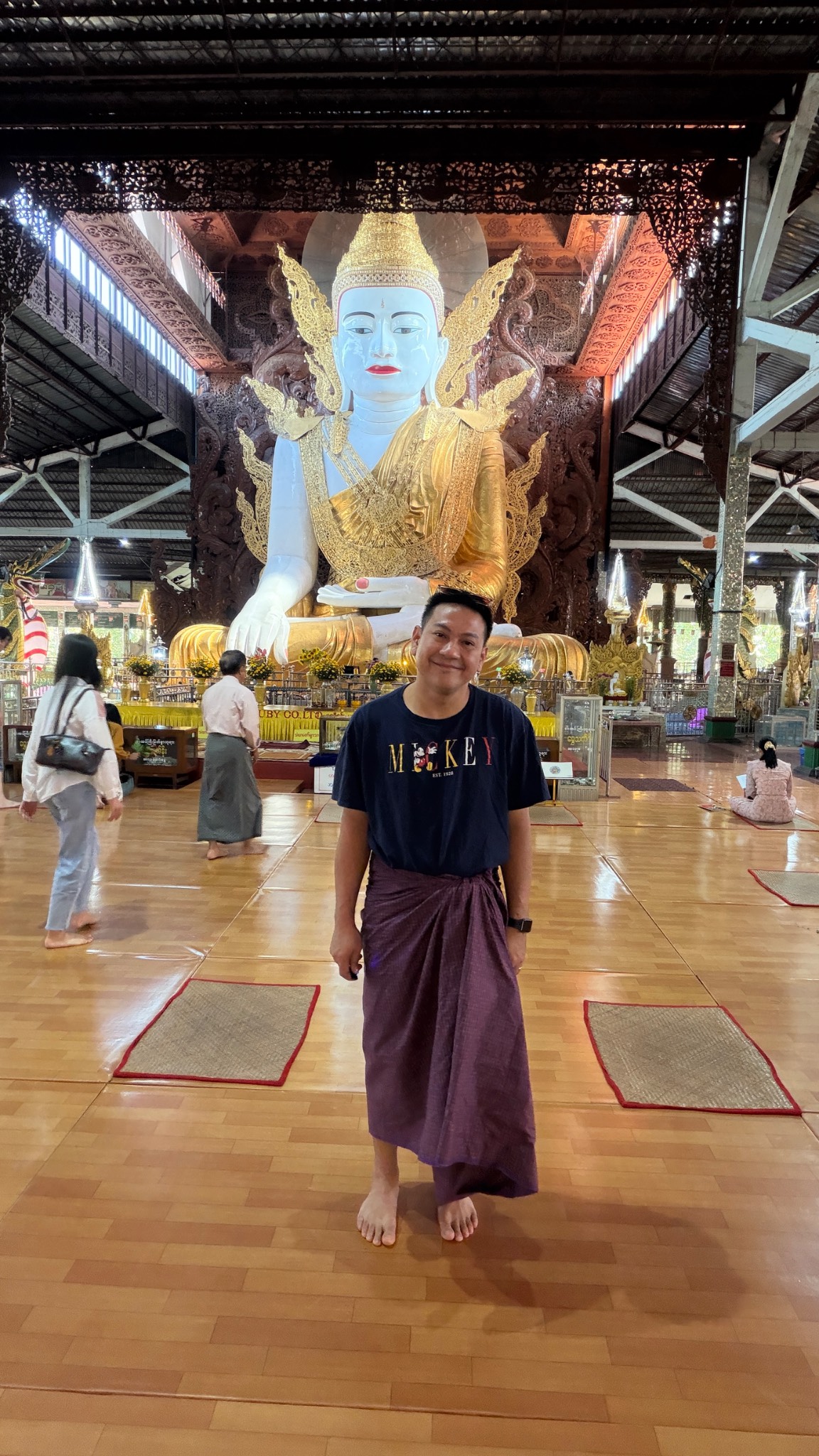 - เดินออกมากจากสนามบิน มาเรียกแกร็ปเพื่อจะไปชม เจดีย์ ซูเล่ย์ เราเลือกที่จะแวะซื้อโสร่งใส่ก่อนเข้าชมเจดีย์