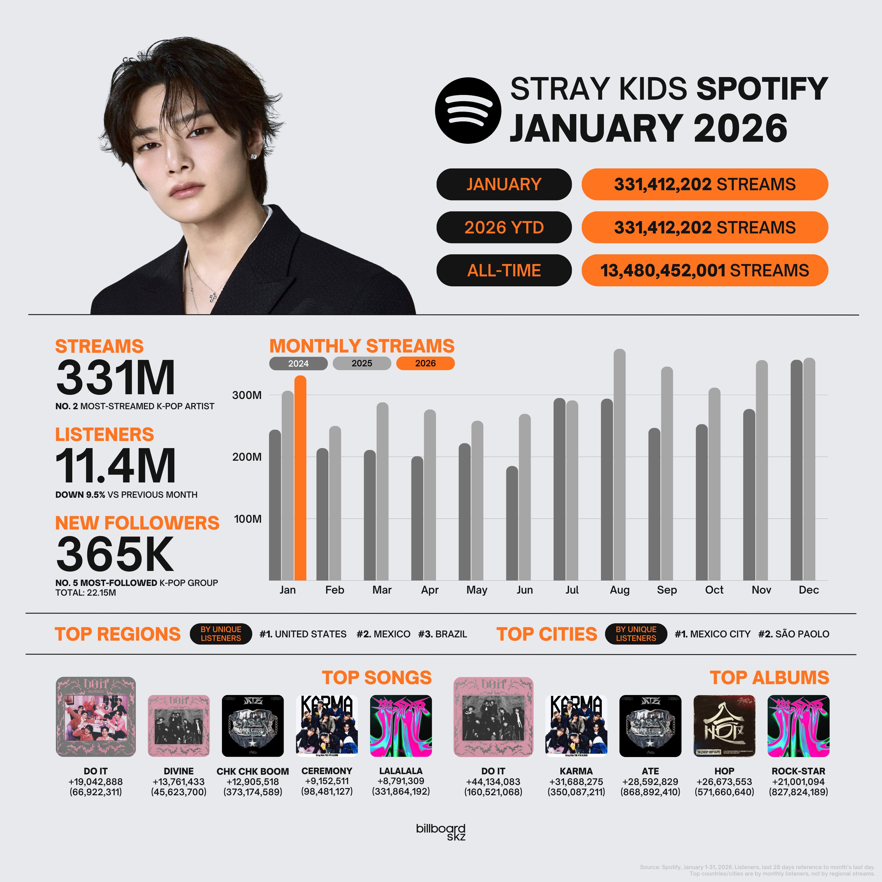 Stray Kids มียอดสตรีม 331,412,202 ครั้งในเดือนมกราคม ซึ่งเป็นครั้งที่ 9 ที่มียอดสตรีมเกิน 300 ล้านครั้งในหนึ่งเดือน พวกเขาเป็นศิลปิน K-Pop ที่มียอดสตรีมมากที่สุดเป็นอันดับ 2