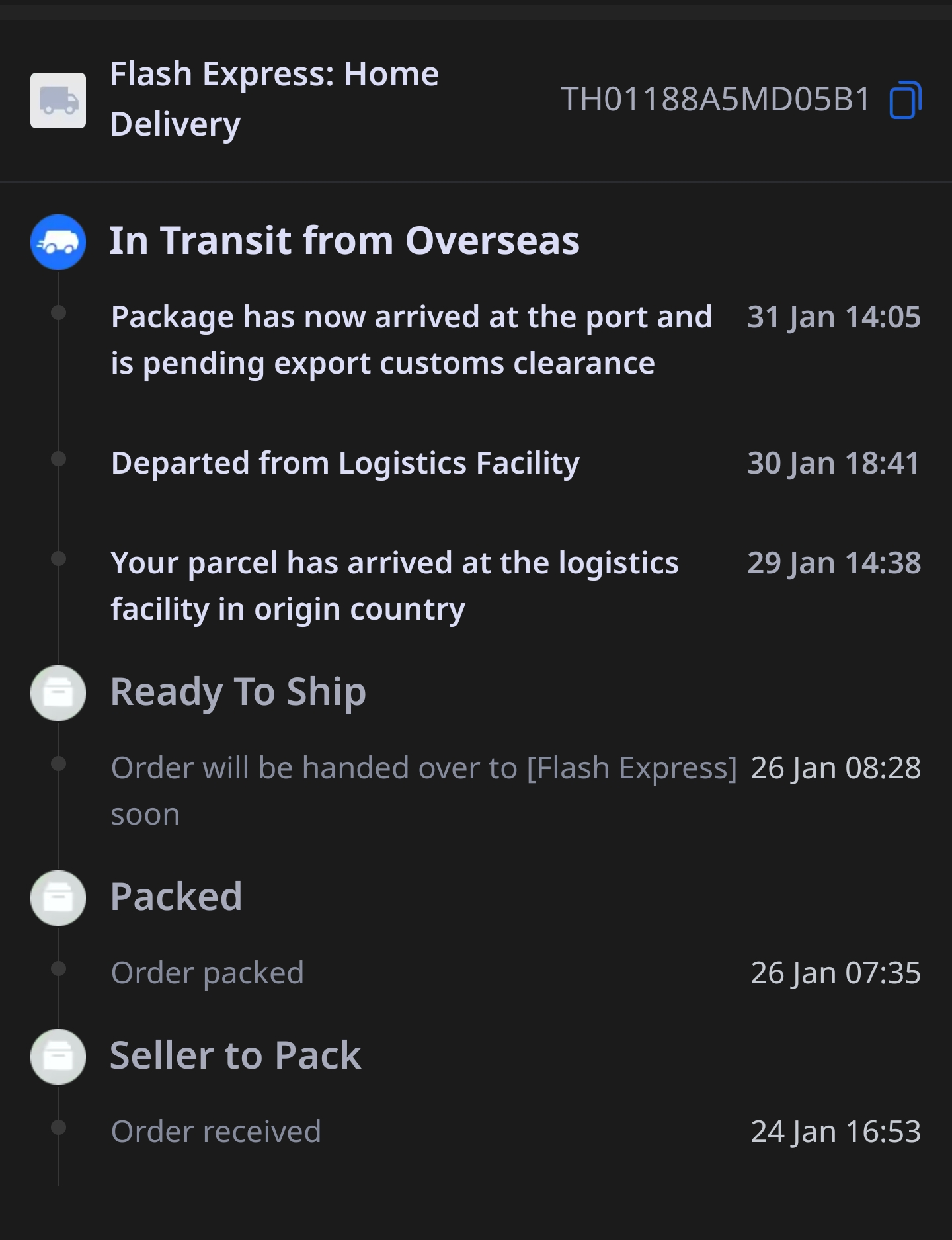 พอดีว่าผมสั่งเคสโทรศัพท์ร้านที่ส่งจากเกาหลีที่เป็นแบรนด์ Official มีชื่อเสียงด้วยไม่ใช่แบรนด์ราคาถูกๆ ซึ่งผมสั่งร้านนี้บ่อยใน Lazada ปกติเมื่อของมาถึงไทย ใช้เวลาแค่วันเดียวของถึงบ้านผมเลย (สั่งมาแล้ว 5 รอบ) รอบนี้ร้านดันส่งผ่าน Flash Express แล้วของติดที่สถานะอยู่ที่ท่าเรืออยู่มา 3 วันแล้วยังไม่ขยับเลย เอาเลข tracking ไปเช็คก็ไม่เจอในระบบ