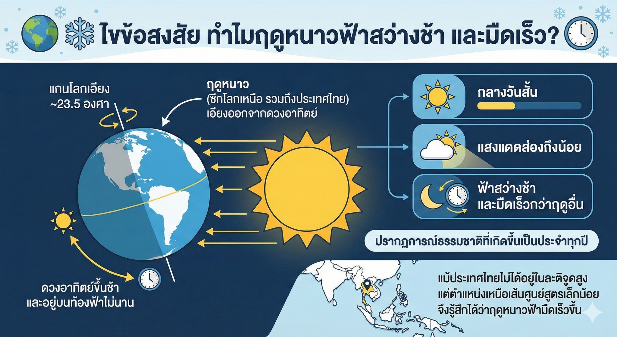 สงสัยกันไหมครับ? ทำไมหน้าหนาวทีไร ฟ้าสว่างช้า แถมมืดเร็วจัง? 🌍❄️