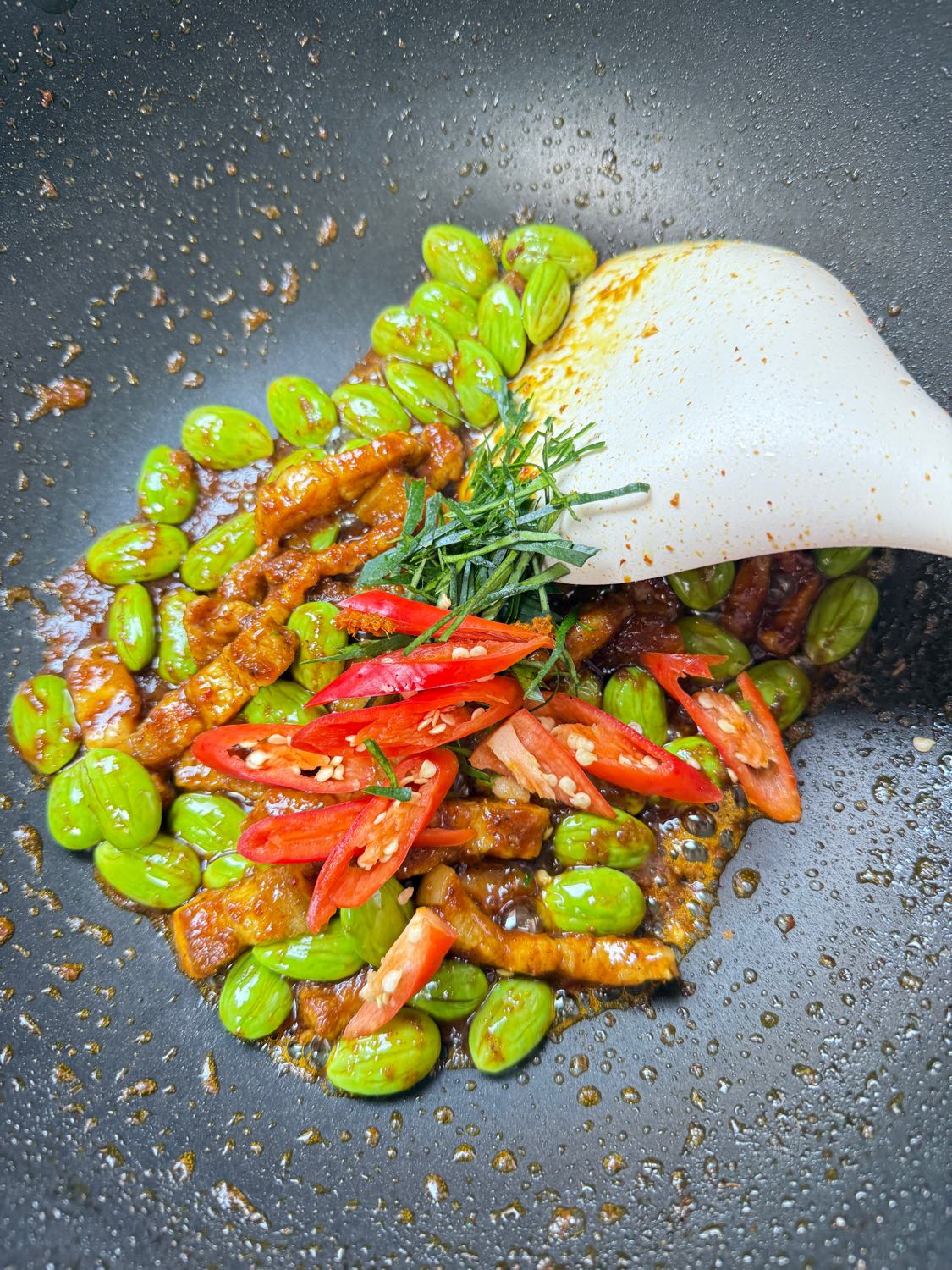 ใส่สะตอลงไป ปรุงรสด้วยซ๊อสฝาเขียวและน้ำปลา คลุกเคล้าดูจนสะตอสุก