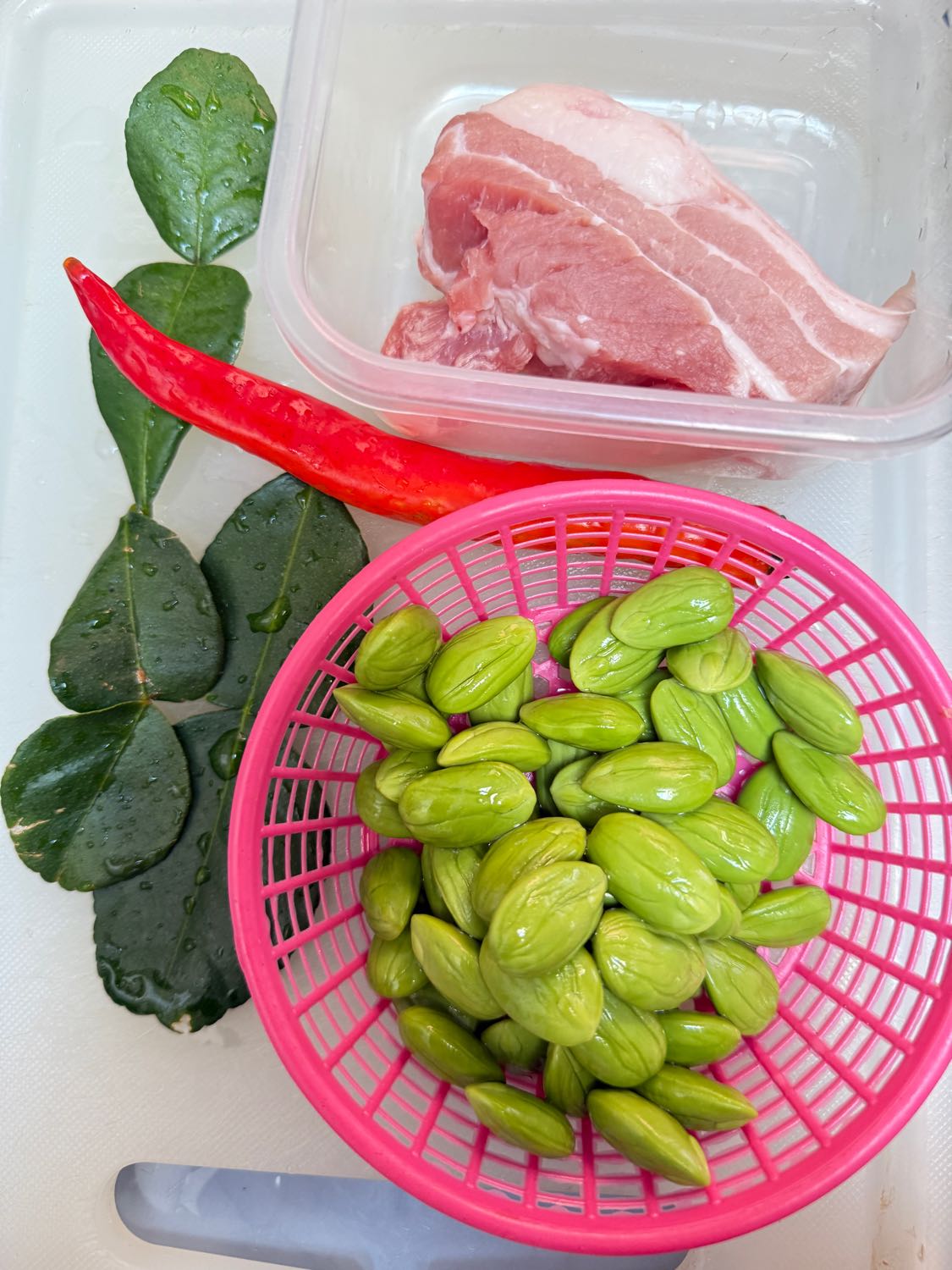 วัตถุดิบพร้อมมาเตรียมปรุงกันครับ ล้างหมูสามชั้นหั่นชิ้นพอดีคำ ซอยใบมะกรูด(ใครชอบฉีกใส่เป็นใบก็ไม่ต้องซอยครับ) หั่นพริกชี้ฟ้าแดง ล้างสะตอให้เรียบร้อย