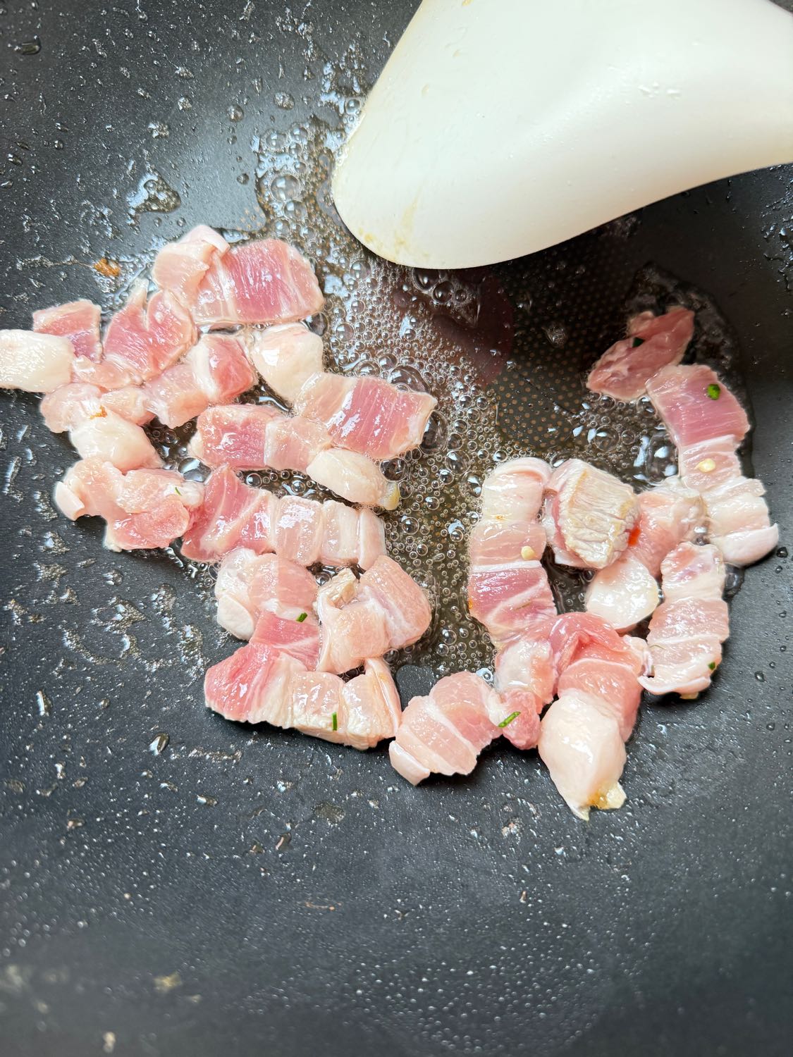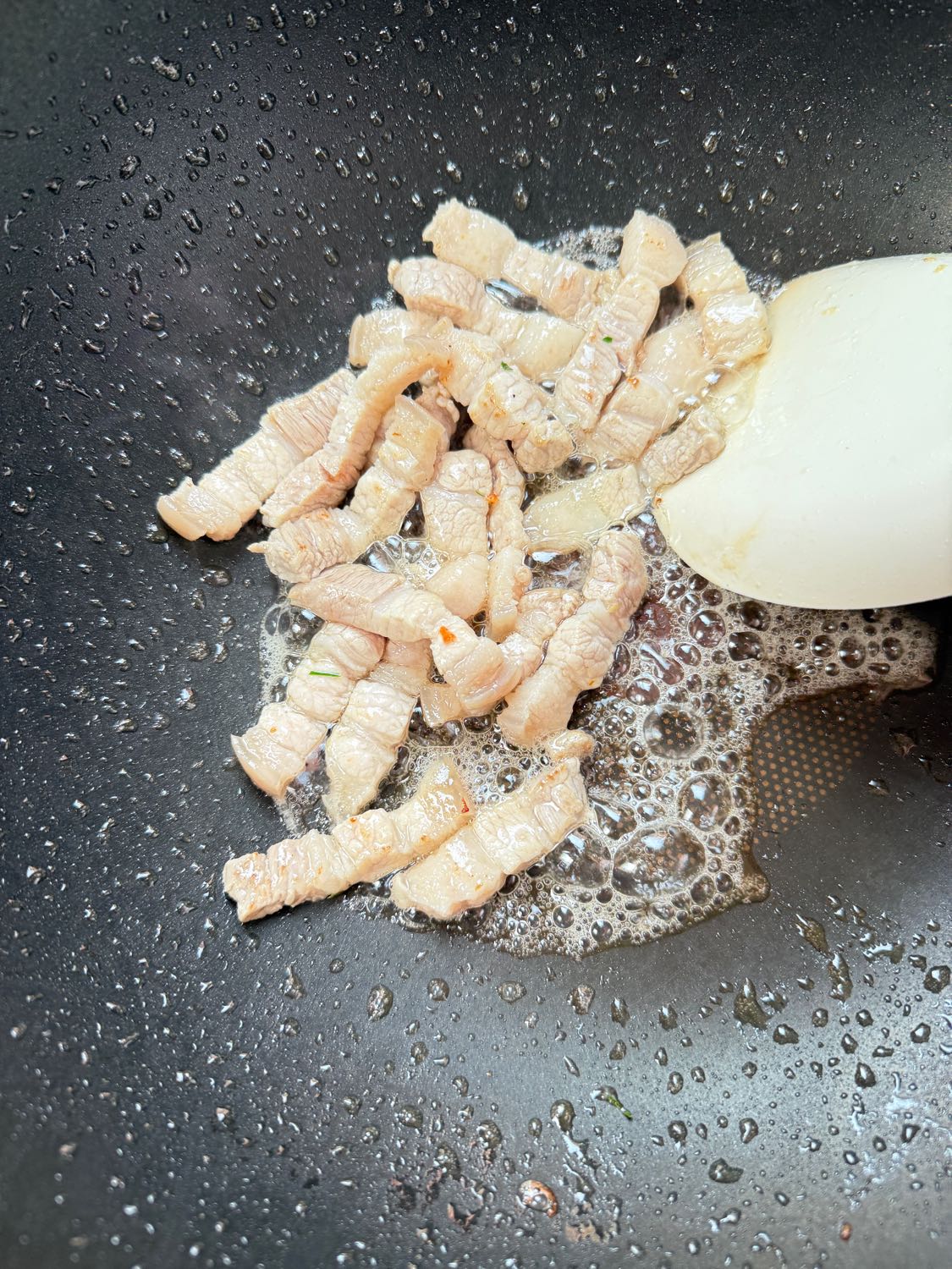 เริ่มปรุงกันเลยครับ ใส่น้ำมันลงกะทะแล้วเอาหมูสามชั้นลงไปรวนให้สุก