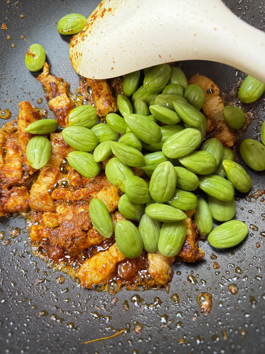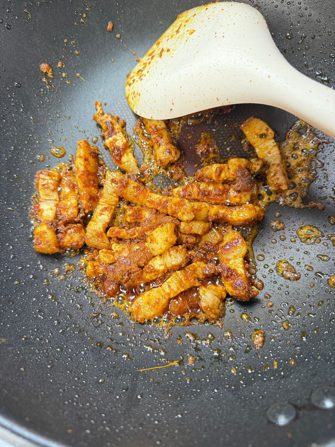 หมูสุกแล้วเขี่ยพักไว้ข้างกะทะก่อน เอาพริกแกงลงไปผัดน้ำมันให้หอม