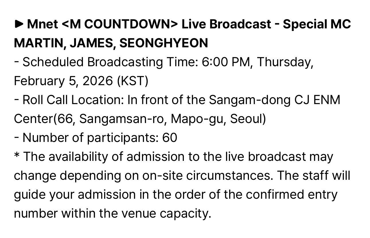 คอร์ติส มาร์ติน(MARTIN), เจมส์(JAMES), ซองฮยอน(SEONGHYEON) จะทำหน้าที่เป็น Special MC ในรายการ M COUNTDOWN ที่จะถ่ายทอดสดในวันที่ 5 กุมภาพันธ์นี้ เวลา 16:00 น. (ไทย)
