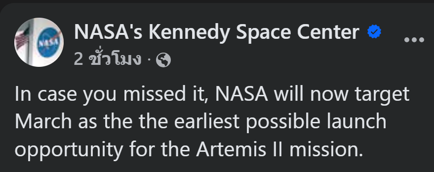 ทาง NASA  ได้เลื่อนการปล่อยยาน Artemis II ไปเป็นอย่างเร็วที่สุดเดือนมีนาคม ครับ