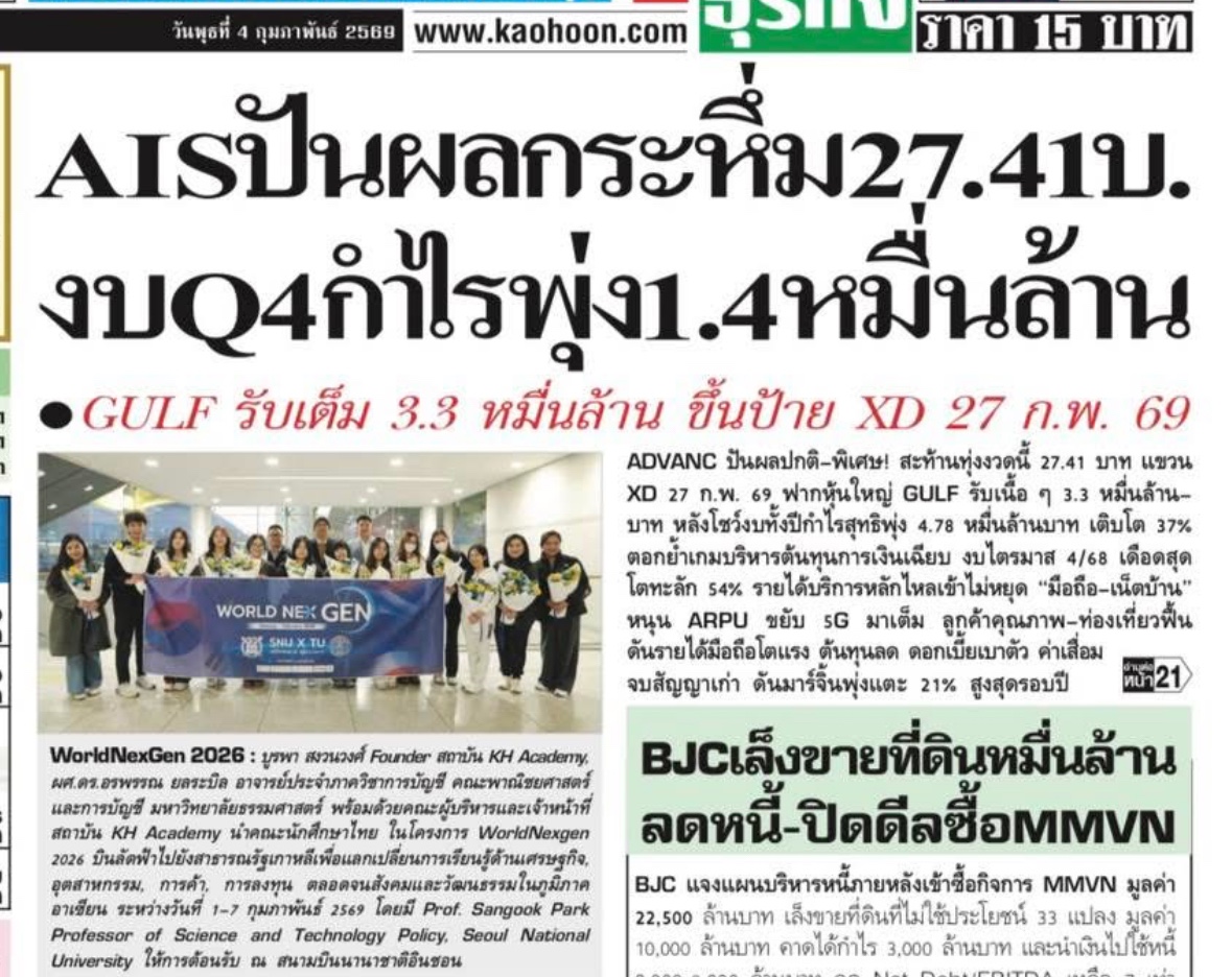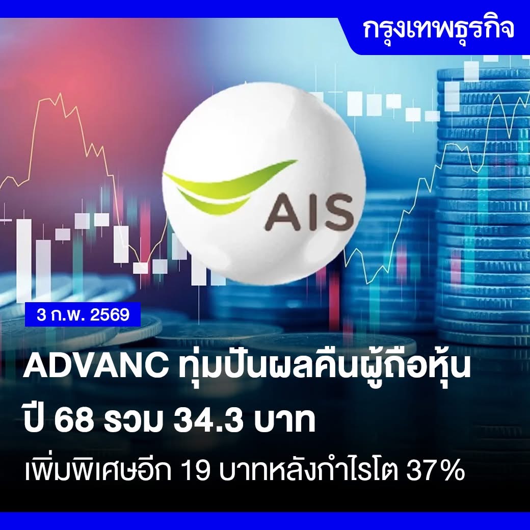 เจ้าสัว ADVANC ควักปันผลปี 68 แตะ 34.30 บาทต่อหุ้น จ่ายปกติทั้งปี 15.3 บาท จากครึ่งปีหลังจ่ายปันผลที่ 8.41 บาท และปันผลพิเศษอีก 19 บาท เตรียมขึ้น XD 27 ก.พ. 69 หลังกำไร 4.7 หมื่นล้านบาท โต 37 % จากปีก่อน