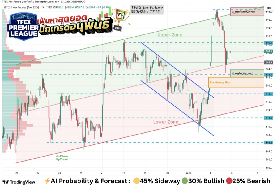📉 Outlook&Tactical Plan :ราคายังคงเป็นขาขึ้น แม้จะถูกทุบหลุด 892 จุดที่เคยเป็น High เก่า แต่ยังยืนเหนือ Upper Zone วันนี้ลุ้นเลี้ยงตัวกลับขึ้นไปเหนือ 892 อีกครั้ง และไม่ควรหลุด 882 ที่เป็น Low เมื่อวาน