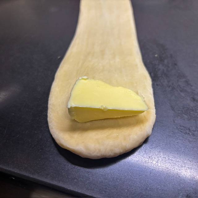 รีดเป็นแผ่น แล้วใส่เนยลงไป พักไว้