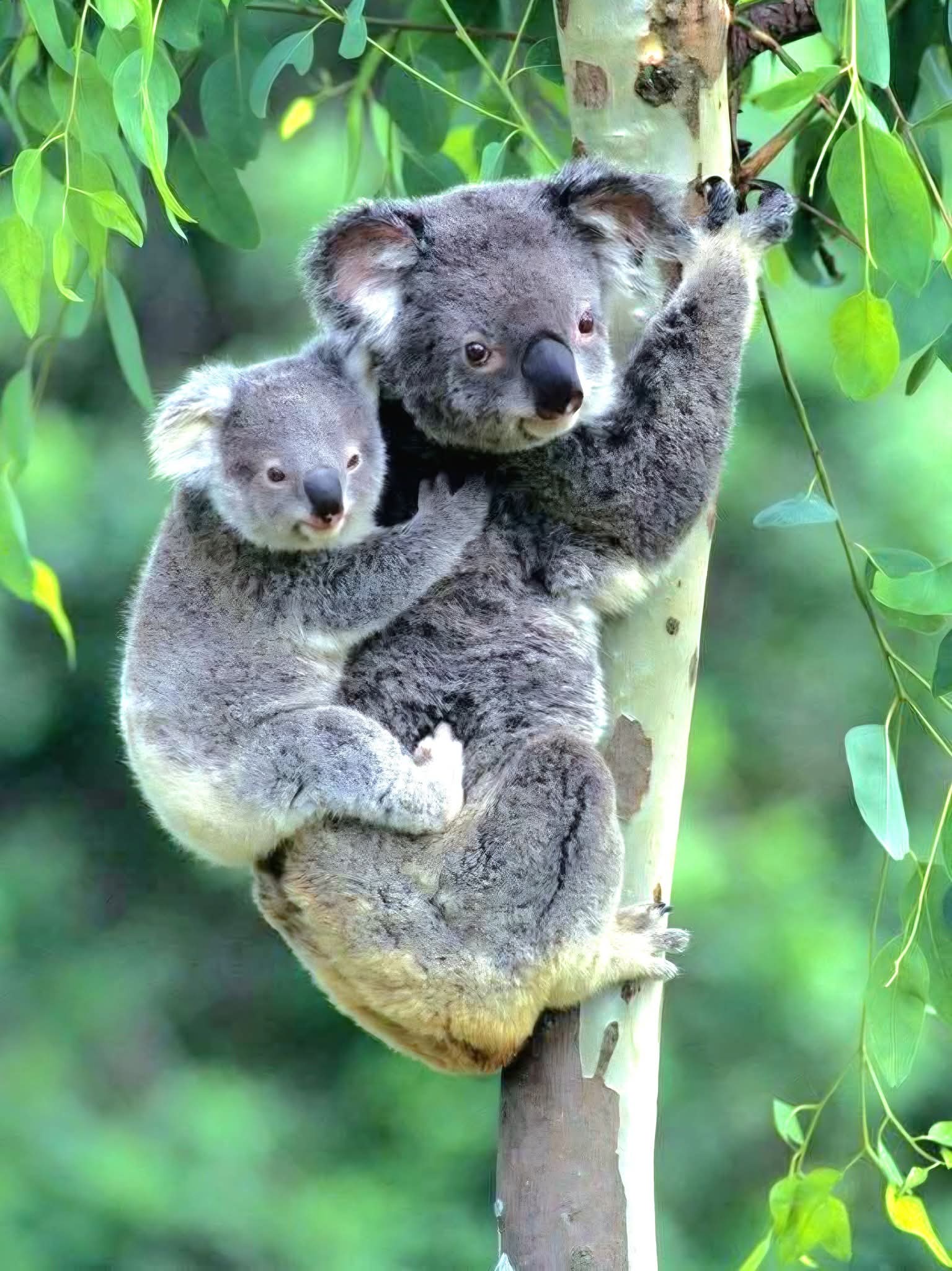 🐨🌿แม่จะใช้ขาหน้าและขาหลังโอบรัดลำต้นไม้ไว้ ส่วนลูกจะเกาะแน่นอยู่ที่แผ่นหลังส่วนบนหรือบริเวณต้นคอ เพื่อให้ศูนย์ถ่วงของแม่ไม่เสียไป