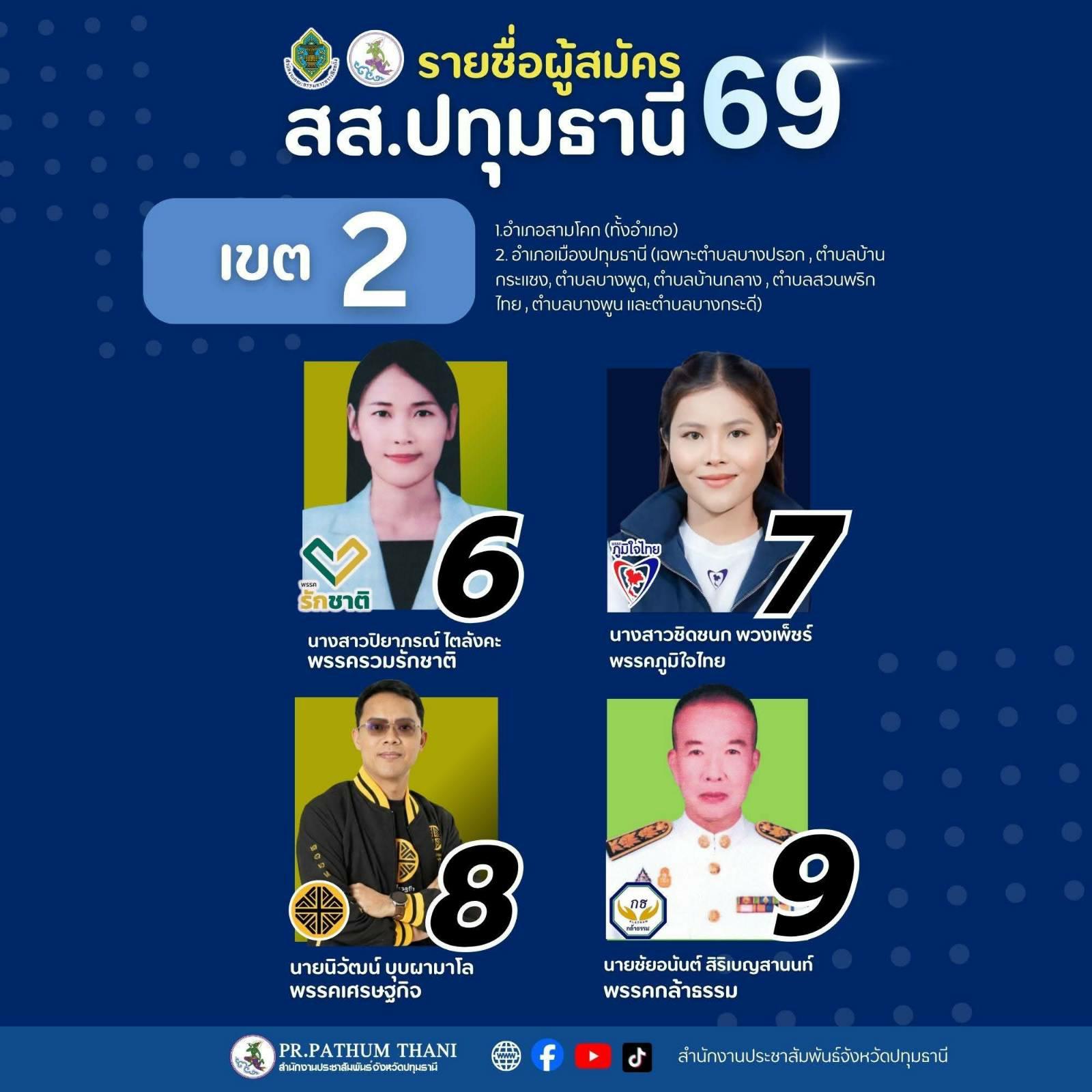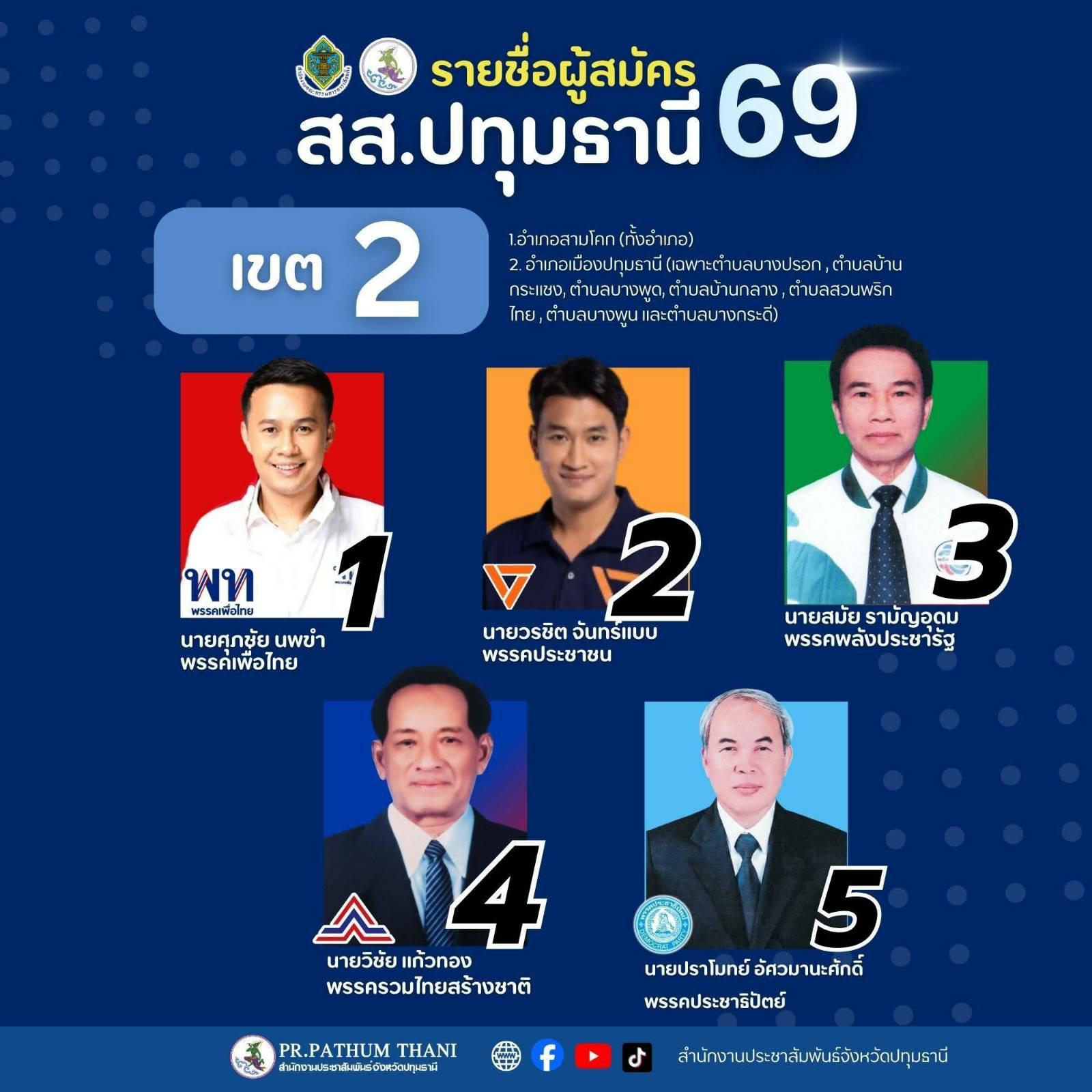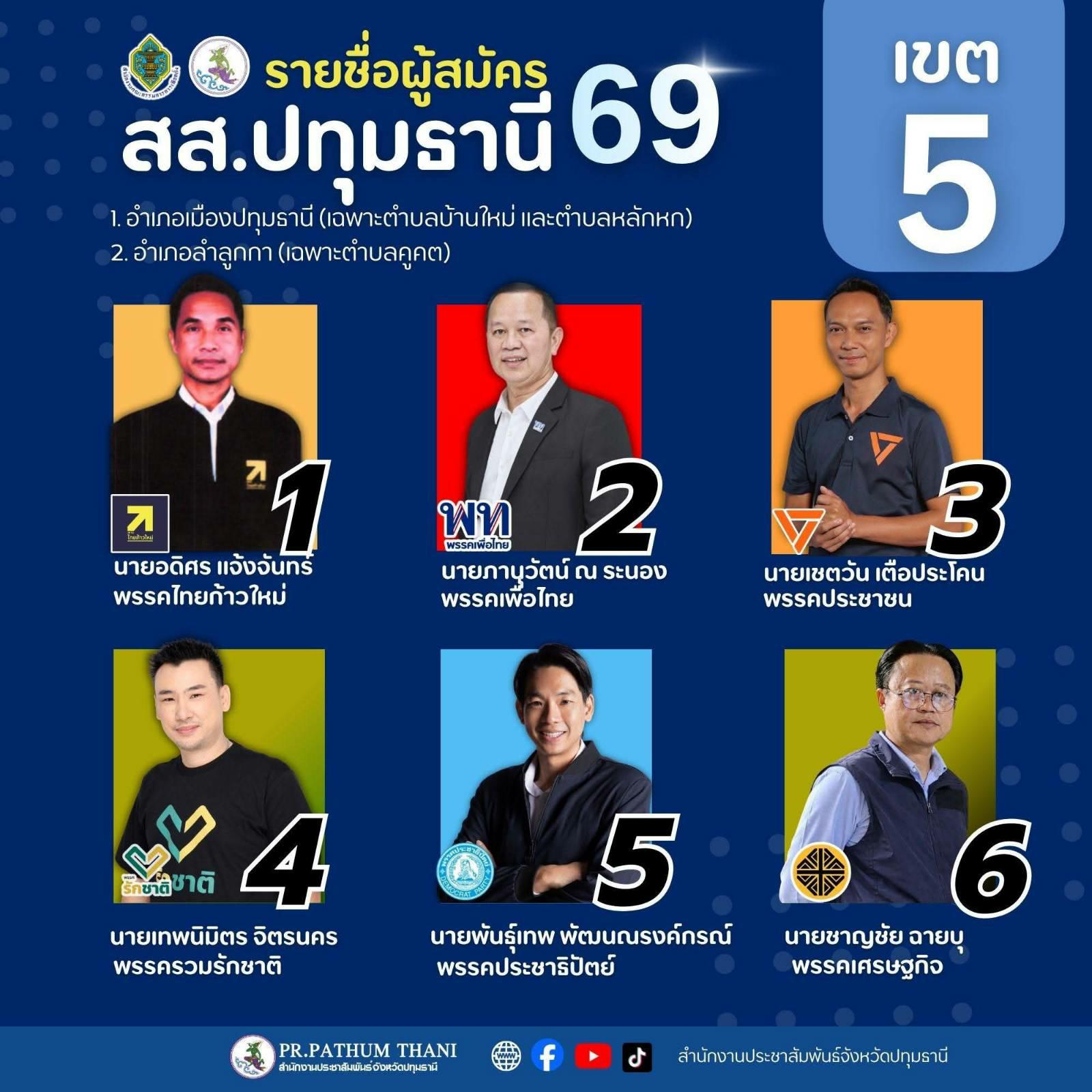 เปิดรายชื่อผู้สมัครสมาชิกสภาผู้แทนราษฎร (สส.) ปี 2569 จังหวัดปทุมธานี ครบทั้ง 8 เขตเลือกตั้ง