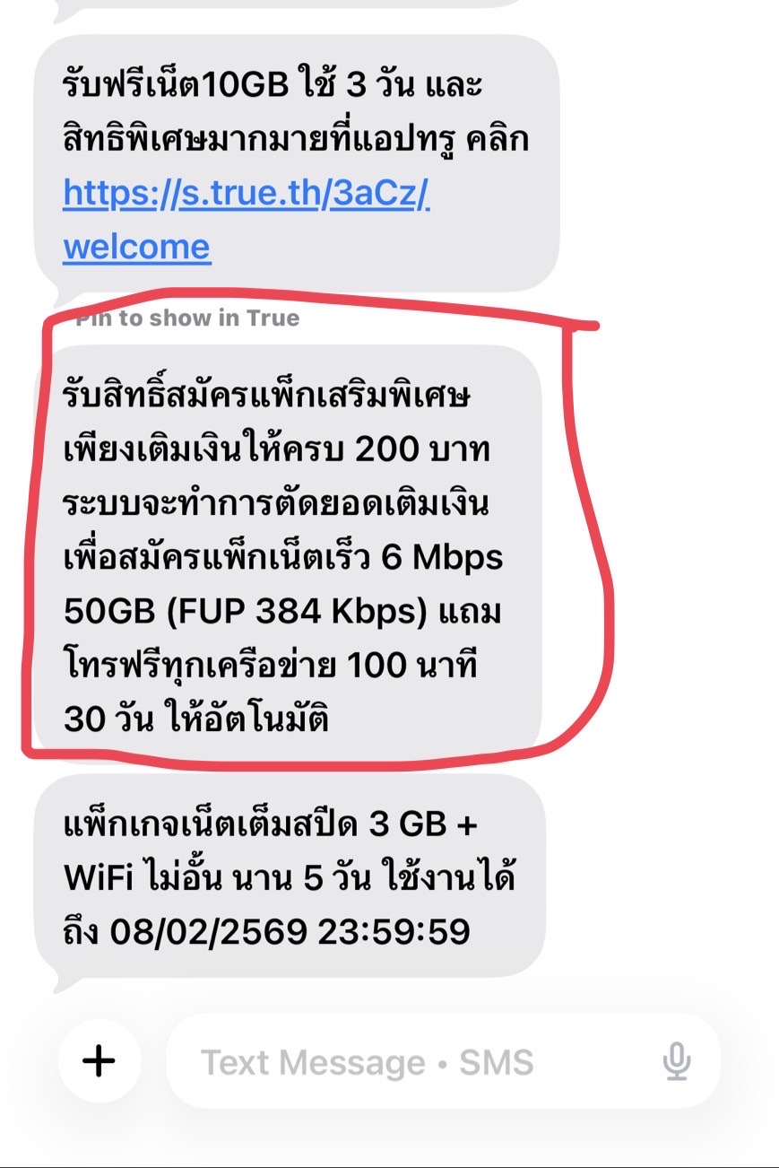 ผมเพิ่งย้ายค่ายจาก AIS มา True วันนี้ และได้รับ SMS แจ้งว่าถ้าเติมเงินครบ 200 บาท ระบบจะสมัครแพ็กเกจเน็ต 6 Mbps 50GB + โทรฟรี ให้อัตโนมัติ