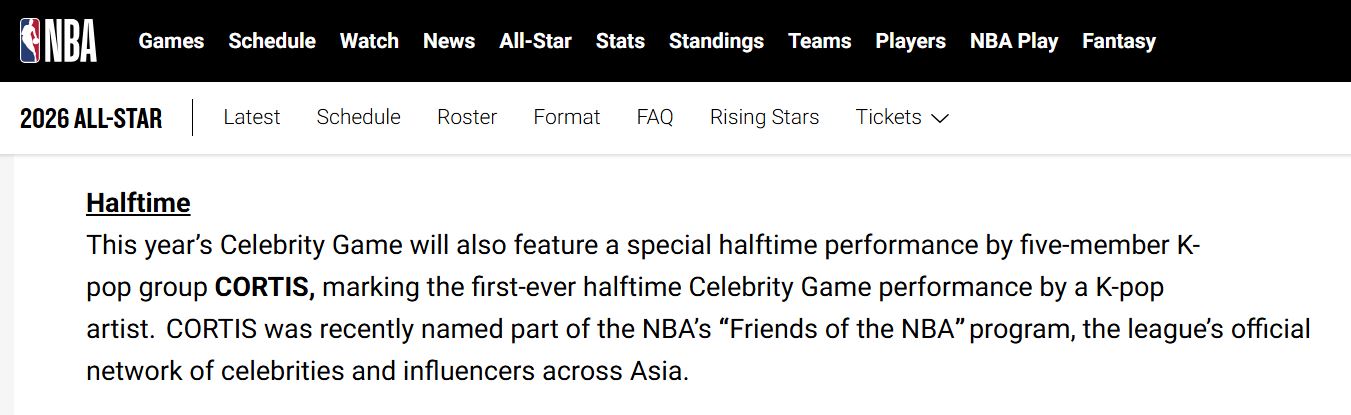 5 สมาชิกวงเคป็อบ "CORTIS" มาร์ติน เจมส์ จูฮุน ซองฮยอน และ กอนโฮ จะทำการแสดงในช่วงพักครึ่งของเกม NBA All-Star Celebrity Game ปี 2026 การปรากฏตัวครั้งนี้ถือเป็นการแสดงช่วงพักครึ่งครั้งแรกของศิลปินเคป็อปในเกม Celebrity Game นอกจากนี้ CORTIS ยังเป็นส่วนหนึ่งของโครงการ “Friends of the NBA” ของ NBA ในเอเชียอีกด้วย