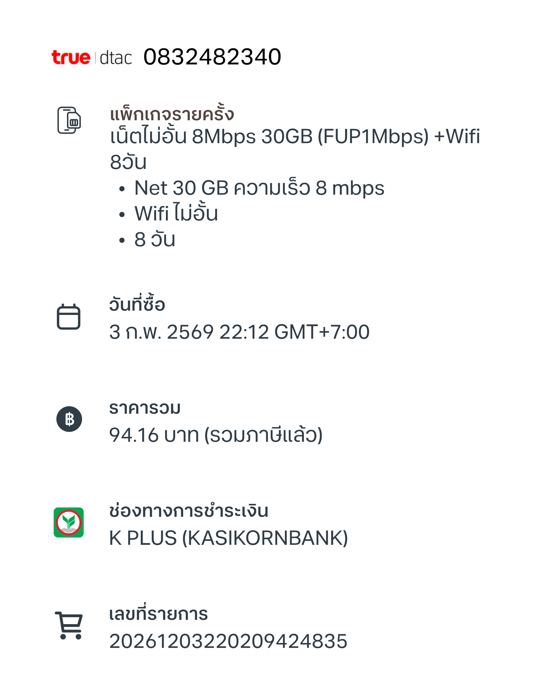 มีวิธีตรวจสอบการสมัคร/ซื้อโปรเน็ตสำหรับซิมเติมเงิน true มั้ยครับ สมัครโปรเน็ต99 gb 30 วัน ราคา 300กว่าบาท เมื่อ 29/1/2569 ใส่เราเตอร์ปล่อยไวไฟ เล่นเนต ดูหนัง ผ่านมาไม่เกิน10วัน ใช้งานไม่น่าถึง99Gb แต่