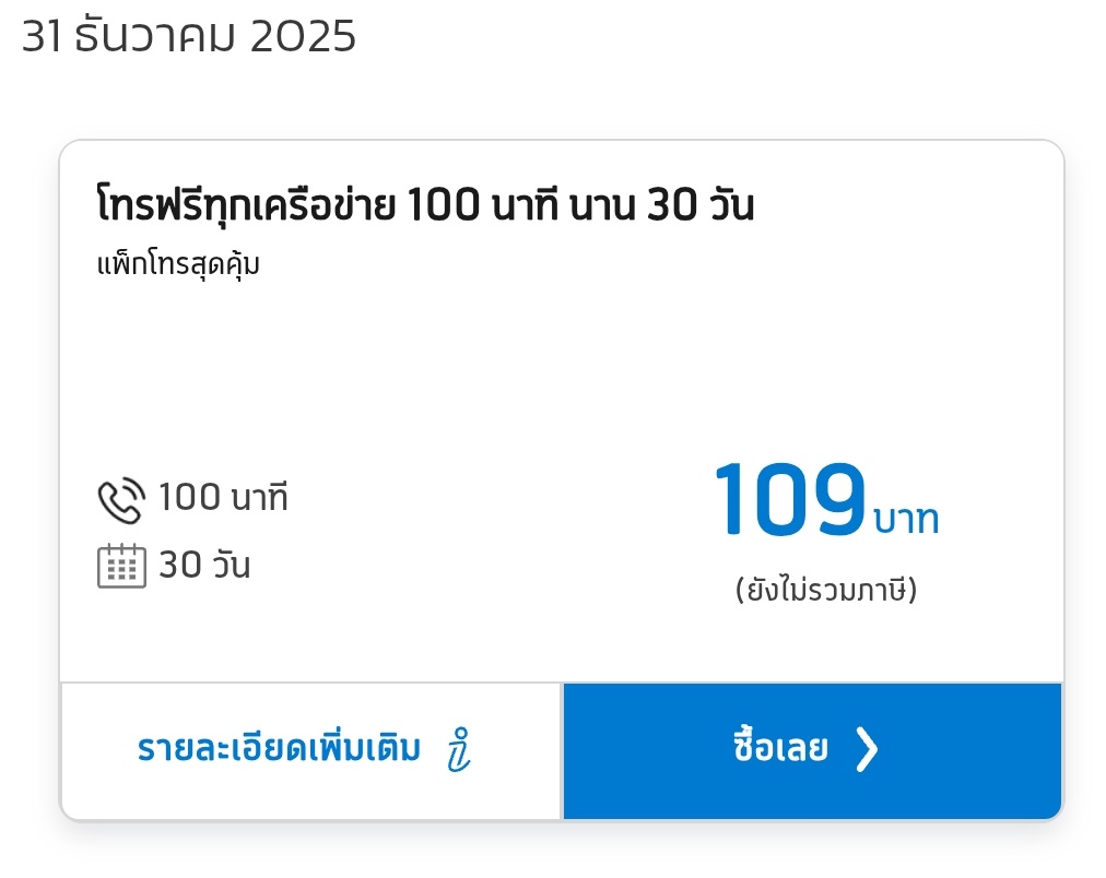 โอเค ตรงนี้ผมผิดเอง ผมเลยไปกดผิดสมัครเอาโป โทรฟรีทุกเครือข่าย 100 นาที 30 วัน 109 บาท ในวันที่ 31 ธ.ค. 2025