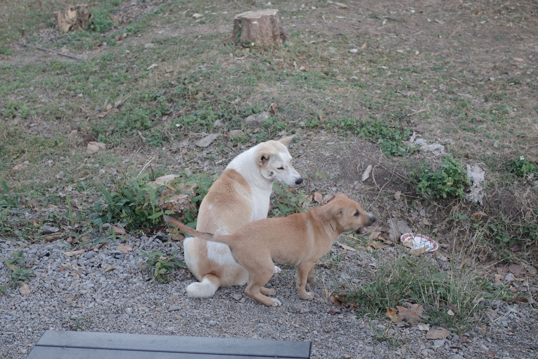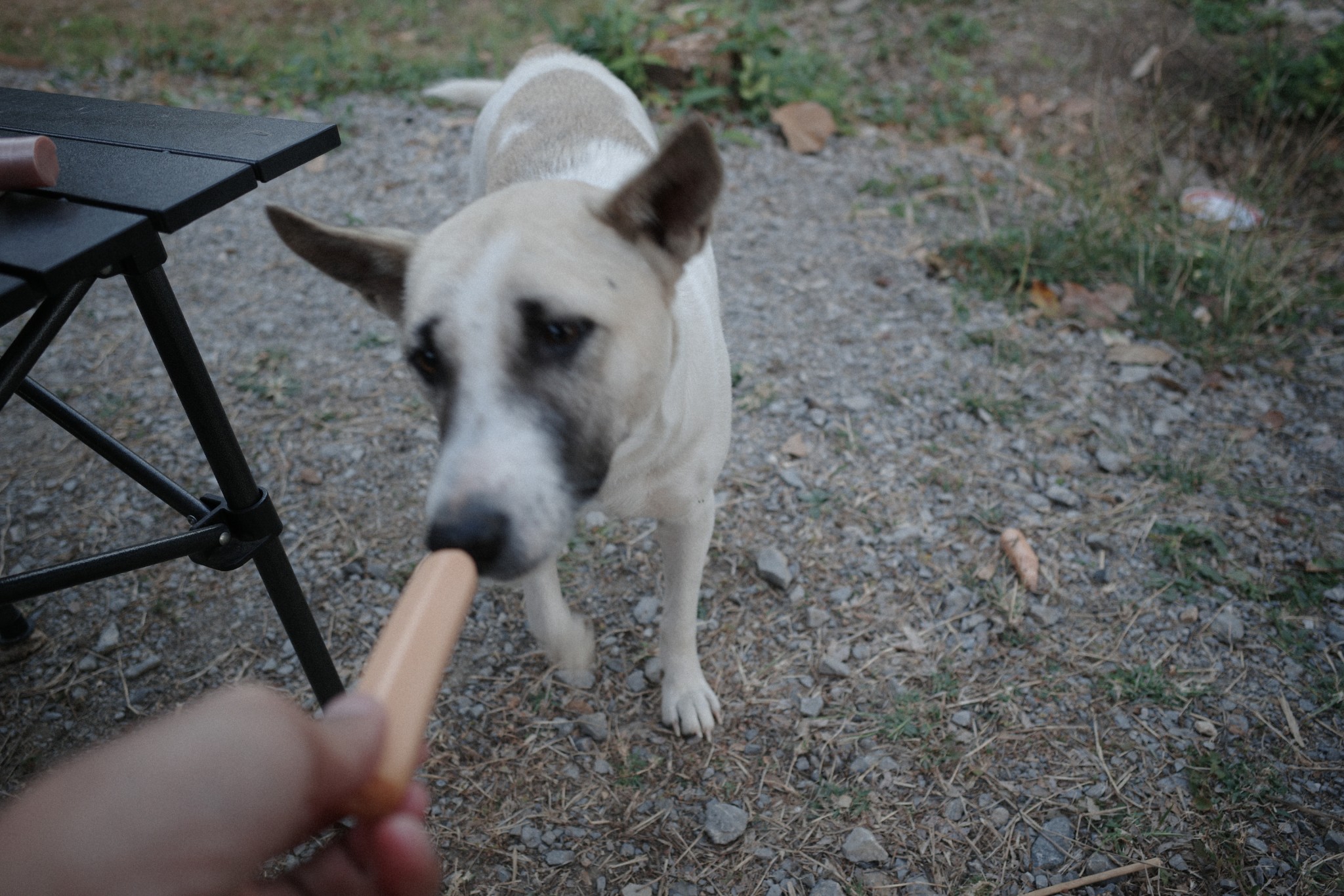 ขอเล่าเรื่องน้องหมาหน่อย ตัวลายที่เห็นผมเดาว่าน่าจะเป็นแม่ ส่วนตัวเล็กเป็นลูก แสบซนมากกก ผมเห็นความน่ารักเลยกะจะแจกเสบียงเป็นไส้กรอกซะหน่อย ตั้งใจแบ่งให้เท่าๆ กัน ลูกอัน แม่อัน สลับกันไป แต่เชื่อไหมครับ? ทุกครั้งที่ผมยื่นไส้กรอกให้แม่หมา เขากลับไม่ยอมกินเองเลยครับ เขาจะคาบไปวางให้เจ้าตัวเล็กกินก่อนเสมอ แม้เจ้าลูกตัวแสบจะดื้อ จะกินทิ้งกินขว้าง หรือกินอิ่มจนพุงกางแล้ว คุณแม่ลายก็ยังนิ่งและรอจนแน่ใจว่าลูกอิ่มจริงๆ ถึงจะยอมกินส่วนของตัวเอง