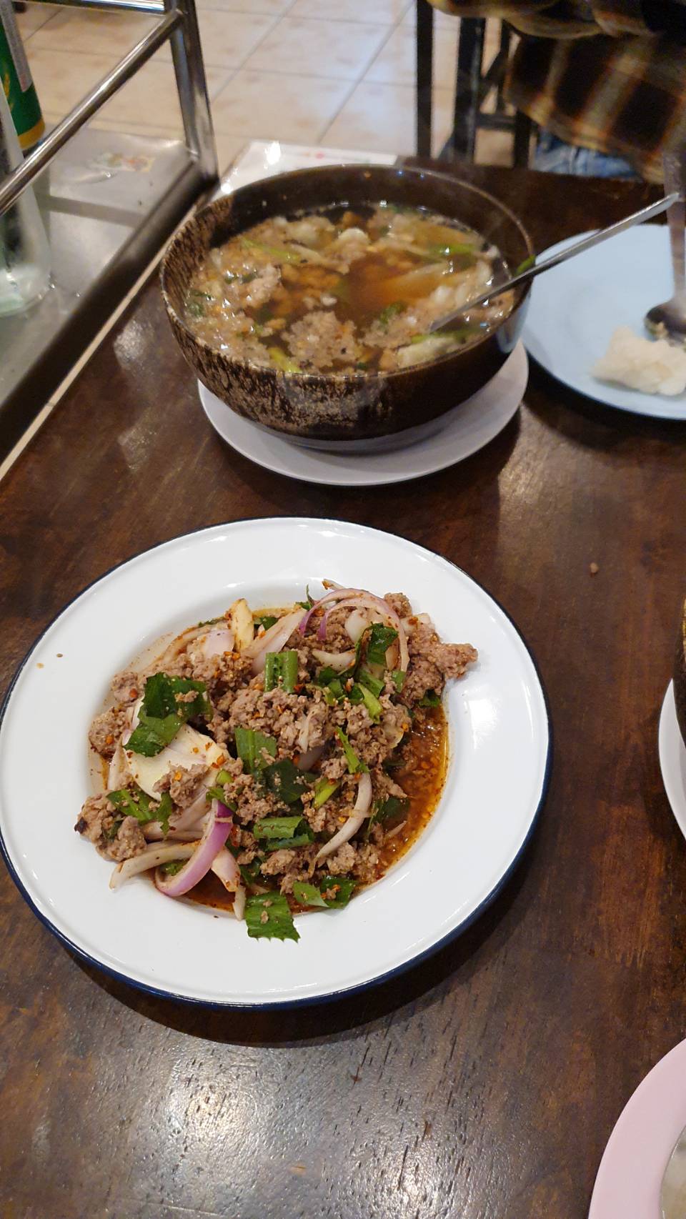 สวัสดีครับ มื้อกลางวันวันนี้ จัดหนักจัดเต็ม หมดไป 90 บาทข้าวราดลาบหมู+ไส้กรอกผัดซอส ราคา 40 บาทต้มจืดหมูเด้ง อีก1ชาม 50 บาท ครับ ข้าวราดยืนเล็งอยู่นานว่าจะกินไรดี เลือกไส้กรอกแดงไว้ในใจละหนึ่งอย่างพอด