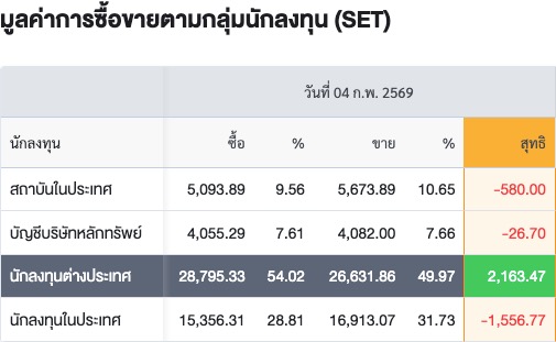Sinthorn Summary 4/2/2569 : ต่างชาติซื้อสุทธิ 2,163.47 ลบ.