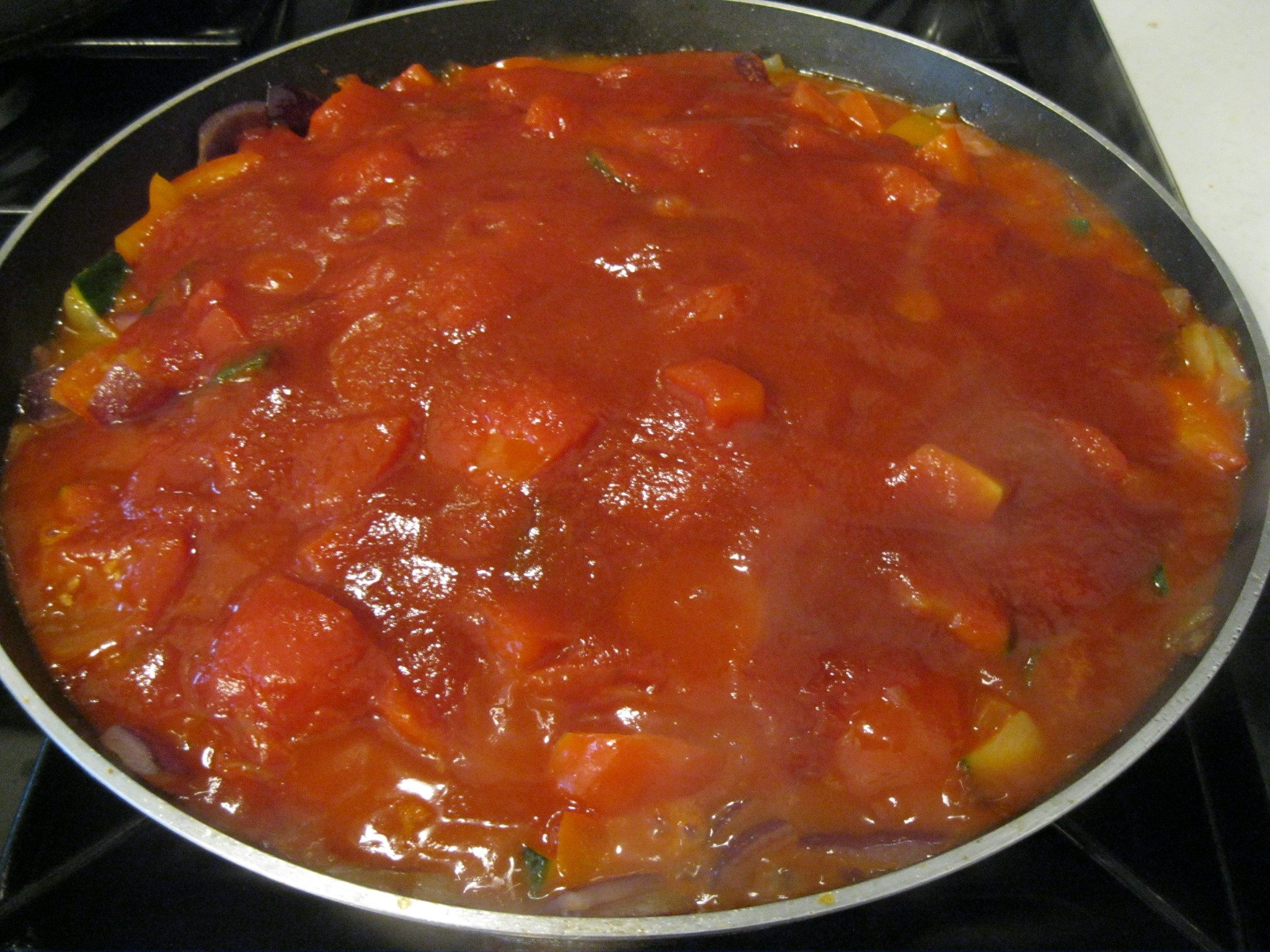 ใส่มะเขือเทศสด มะเขือเทศกระป๋อง ใบไทม์ ปรุงรสด้วย น้ำส้มบัลซามิก เกลือป่น พริกป่น คนให้เข้ากันเคี่ยวด้วยไฟอ่อน