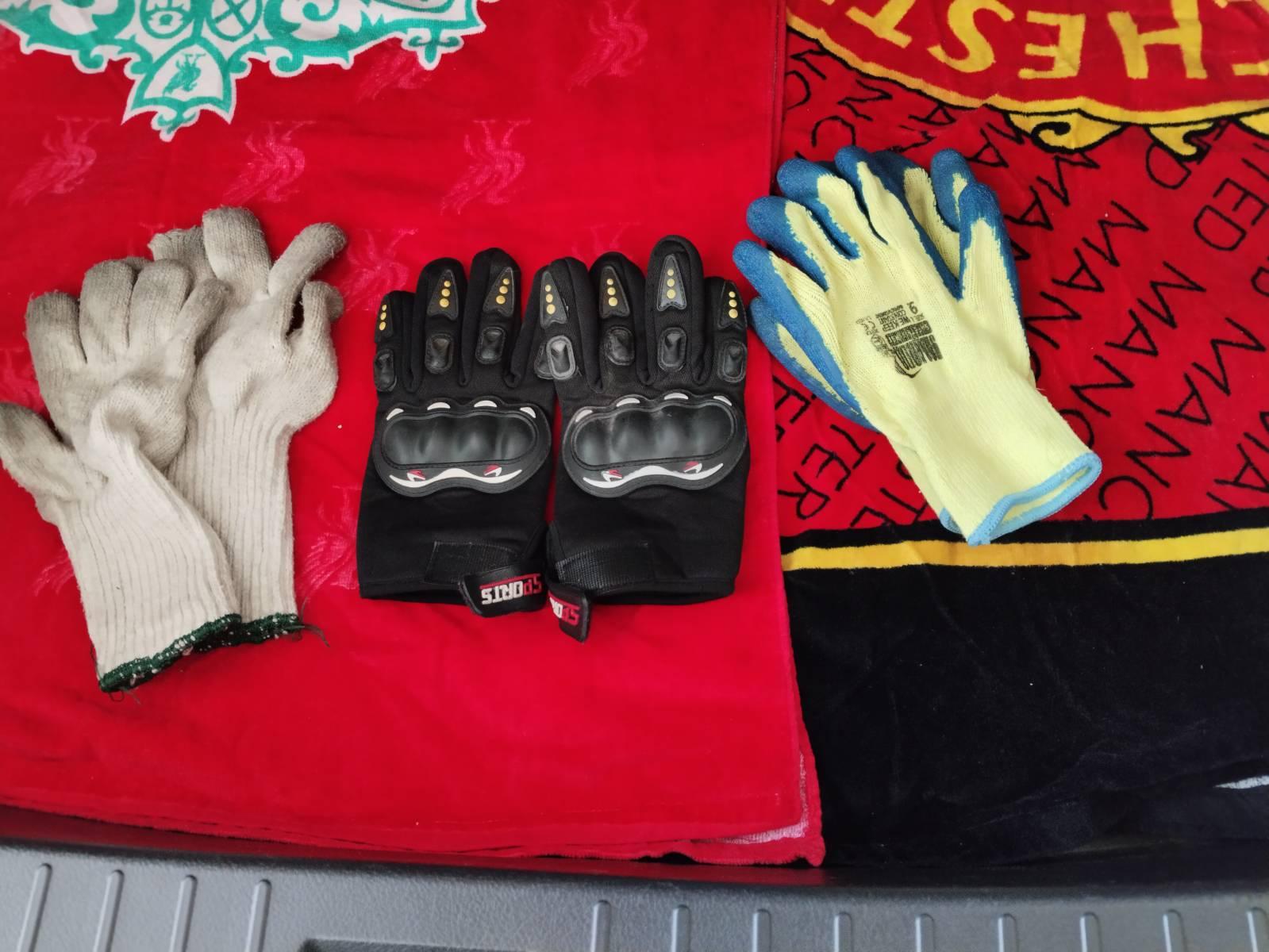 เครื่องมือท้ายรถ มีป้ายเตือน ฉุกเฉิน สองอัน กากบาทขันล้อกับท่อแป๊ป ถุงมือ ผ้าเช็ดตัวไว้รองมุดรถ ที่ห้ามล้อ