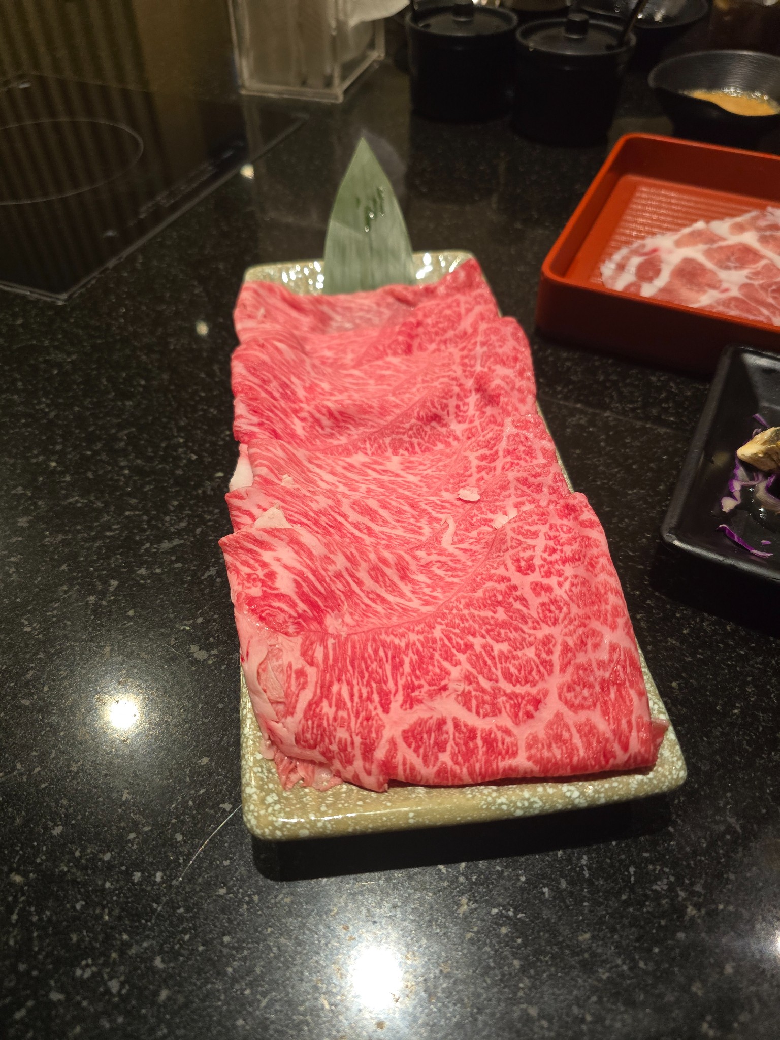 A5 Kagoshima Wagyu: พระเอกของงาน เนื้อลายหินอ่อนแทรกสวยมาก ชิ้นใหญ่เต็มคำ จุ่มในน้ำดำให้พอสะดุ้งแล้วจุ่มไข่ดิบตาม... แสงออกปากครับ ละลายในปากจริงๆ