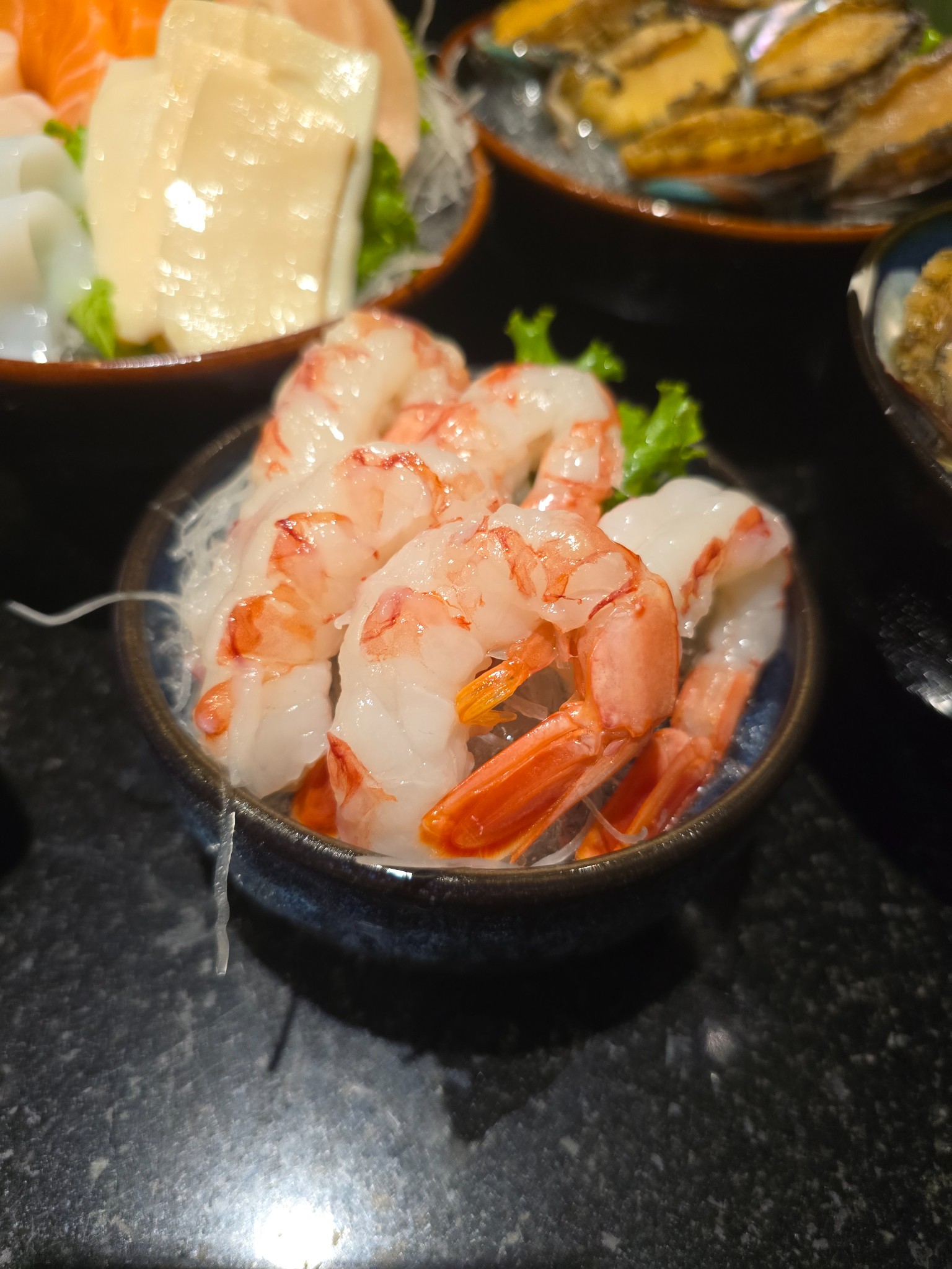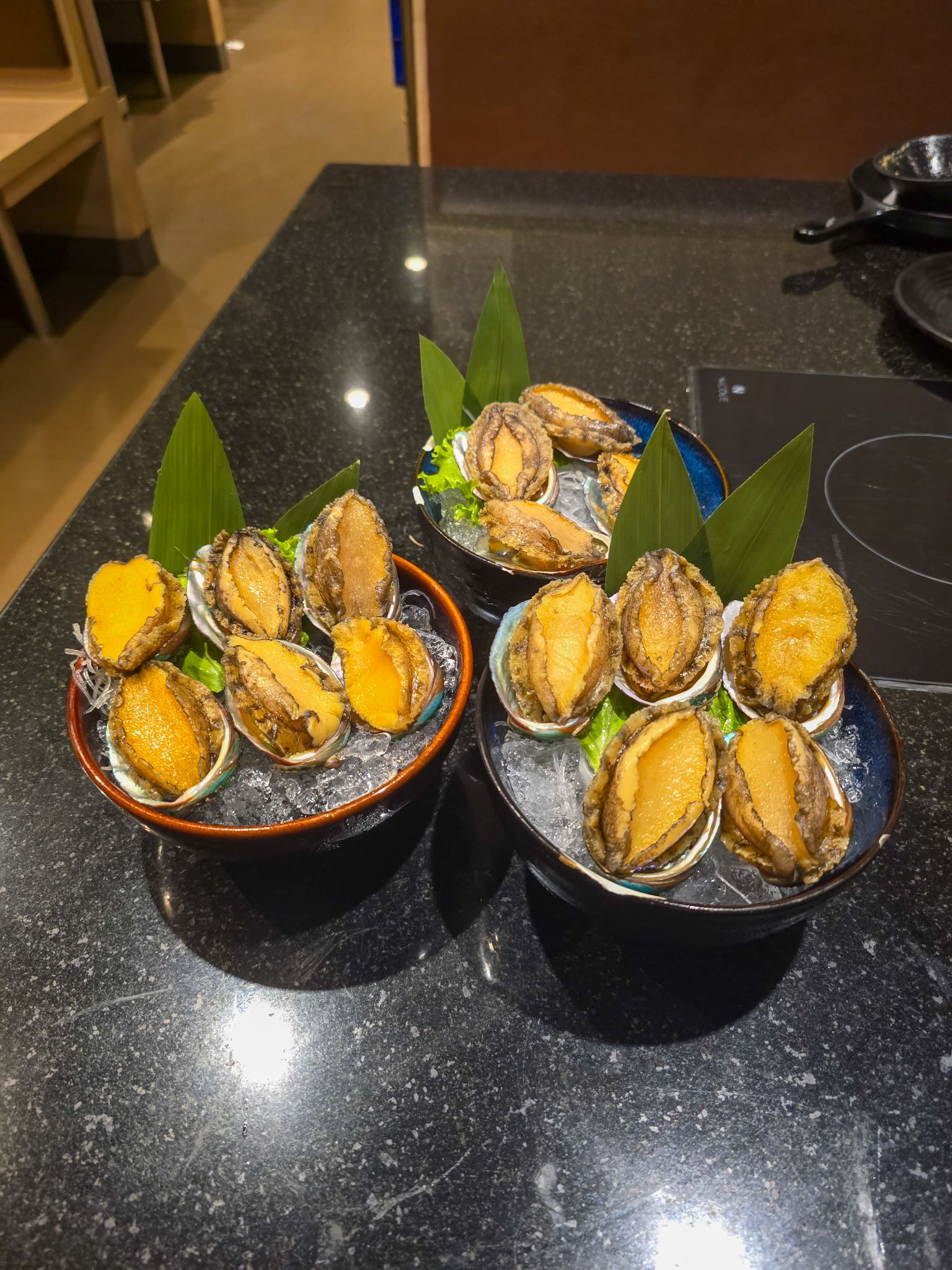อาวาบิ (หอยเป๋าฮื้อสด): เสิร์ฟมาทั้งตัวบนเปลือก เอามาลงหม้อชาบู เนื้อเด้ง สดมาก ผมจัดไปคนเดียว 10 ตัวถ้วน!