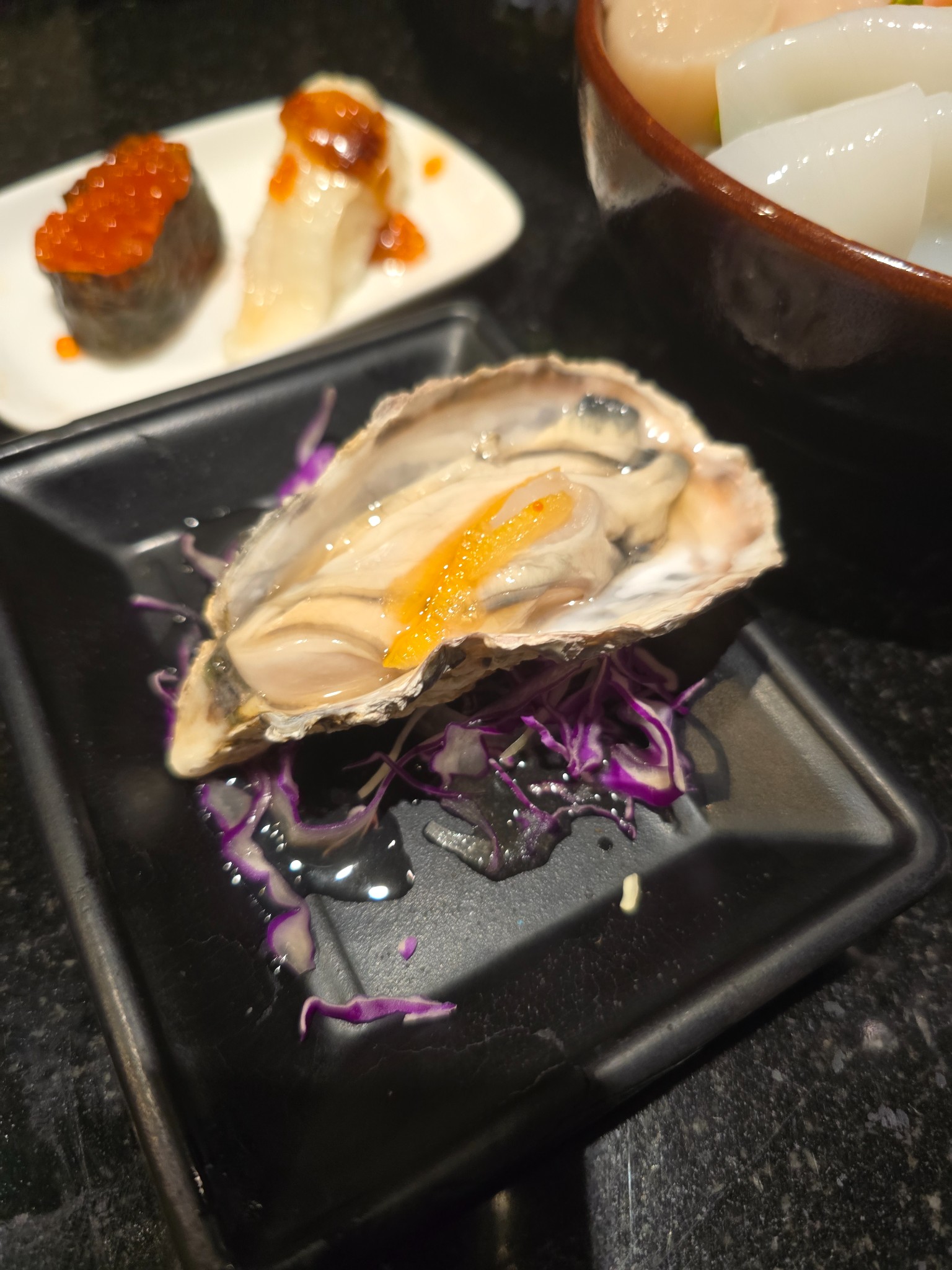 หอยนางรม พอนสึ ยูสุ: หอยไซส์ใหญ่ สดสด ตัดเลี่ยนด้วยผิวส้มยูสุหอมๆ สดชื่นมาก